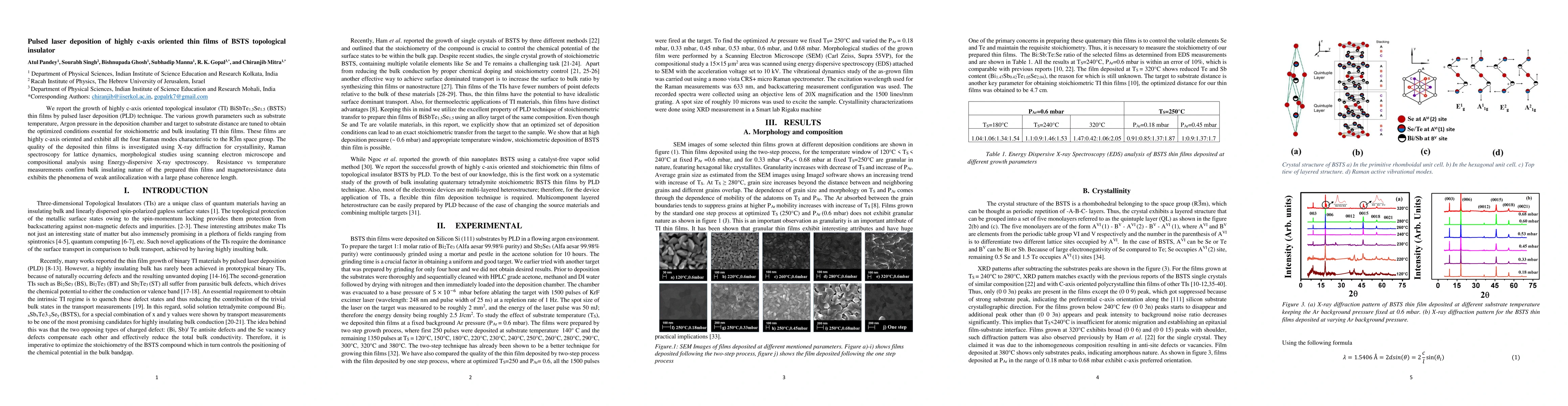 This paper reports the pulsed laser deposition of highly c-axis oriented BiSbTe1.5Se1.5 (BSTS) thin films, demonstrating their topological insulator properties through various characterization techniques, including X-ray diffraction, Raman spectroscopy, and magnetoresistance measurements. The films exhibit bulk insulating behavior and weak antilocalization.