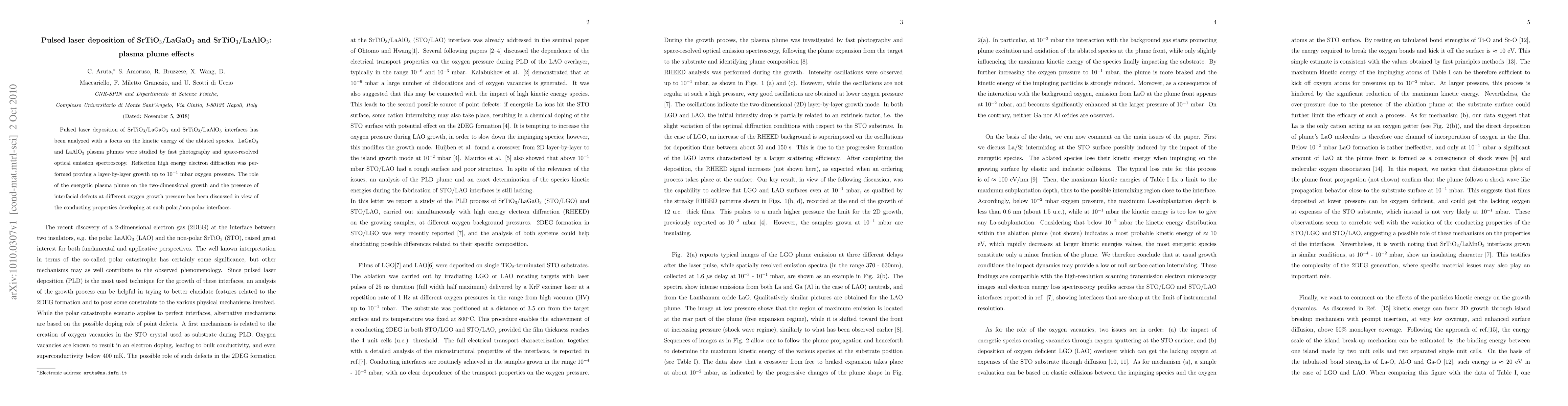 This study investigates the pulsed laser deposition of SrTiO3/LaGaO3 and SrTiO3/LaAlO3 interfaces, focusing on the kinetic energy of ablated species and the effects of plasma plumes. The research employs fast photography and optical emission spectroscopy to analyze the plasma plumes, revealing layer-by-layer growth up to 10-1 mbar oxygen pressure and discussing the impact of energetic plasma on the growth and interfacial defects.