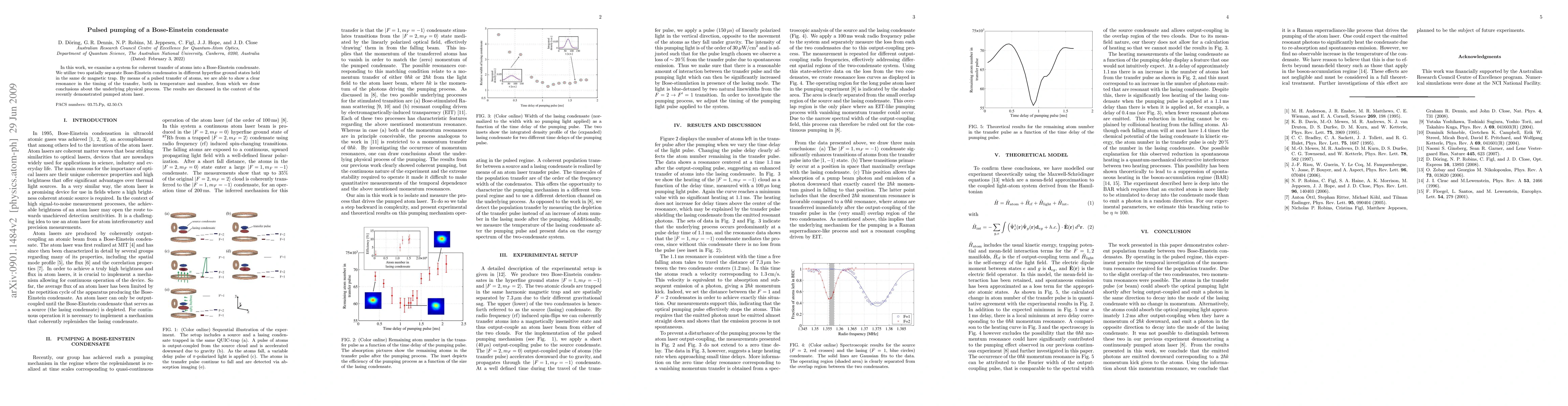 This research investigates a method for transferring atoms coherently into a Bose-Einstein condensate using pulsed pumping, revealing a resonance in atom transfer timing in two spatially separate condensates within a shared magnetic trap. The findings provide insights into the physical mechanisms and relate to the development of pumped atom lasers.