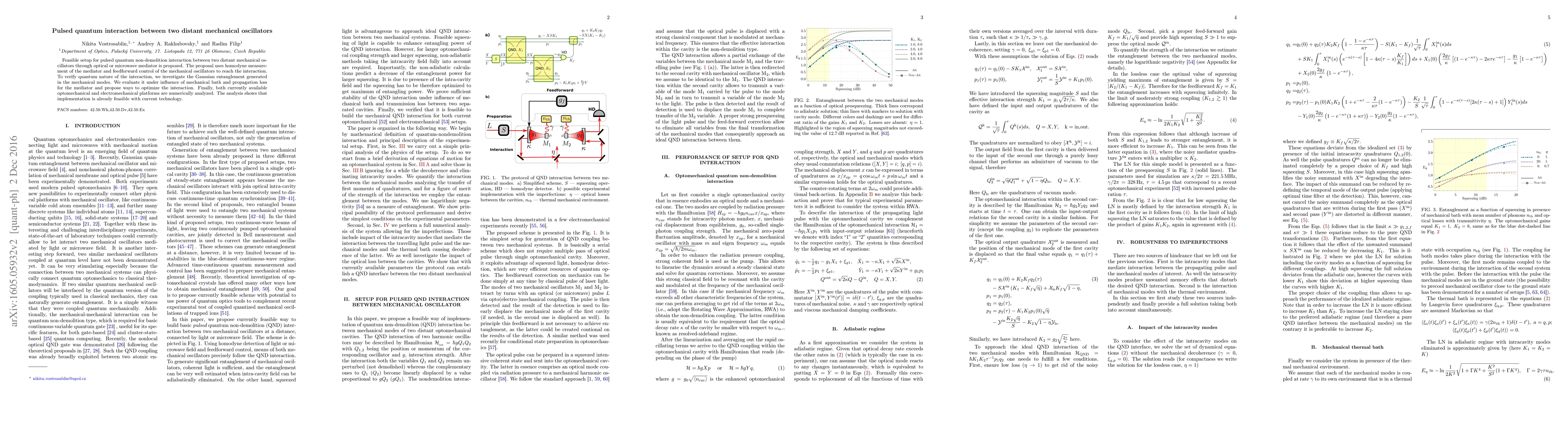 This paper proposes a method for pulsed quantum non-demolition interaction between distant mechanical oscillators using optical or microwave mediators, employing homodyne measurement and feedforward control. It evaluates the feasibility of generating Gaussian entanglement and optimizing the interaction, demonstrating that current technology can implement the proposed setup.