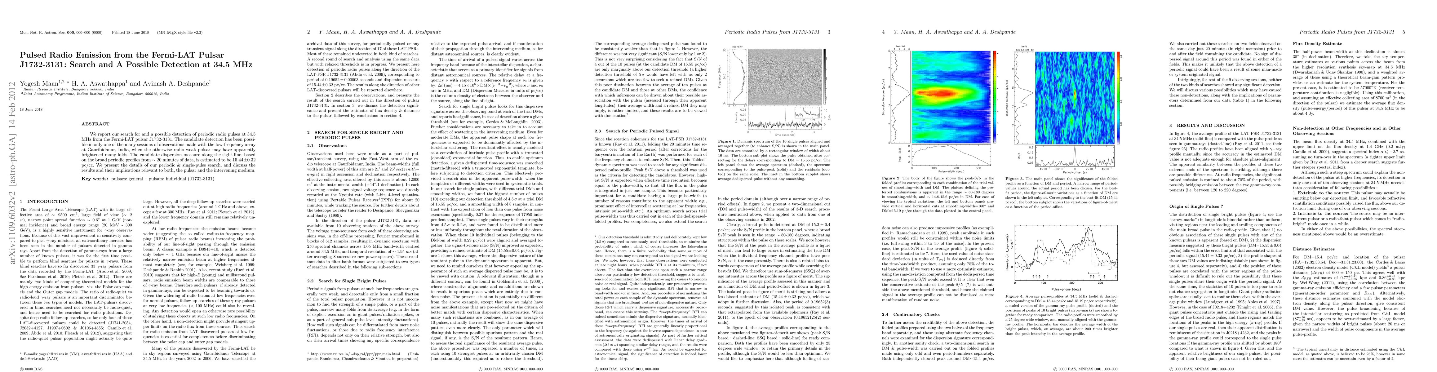 Researchers detected possible periodic radio pulses at 34.5 MHz from pulsar J1732-3131, with a candidate dispersion measure of 15.44 +/-0.32 pc/cc.