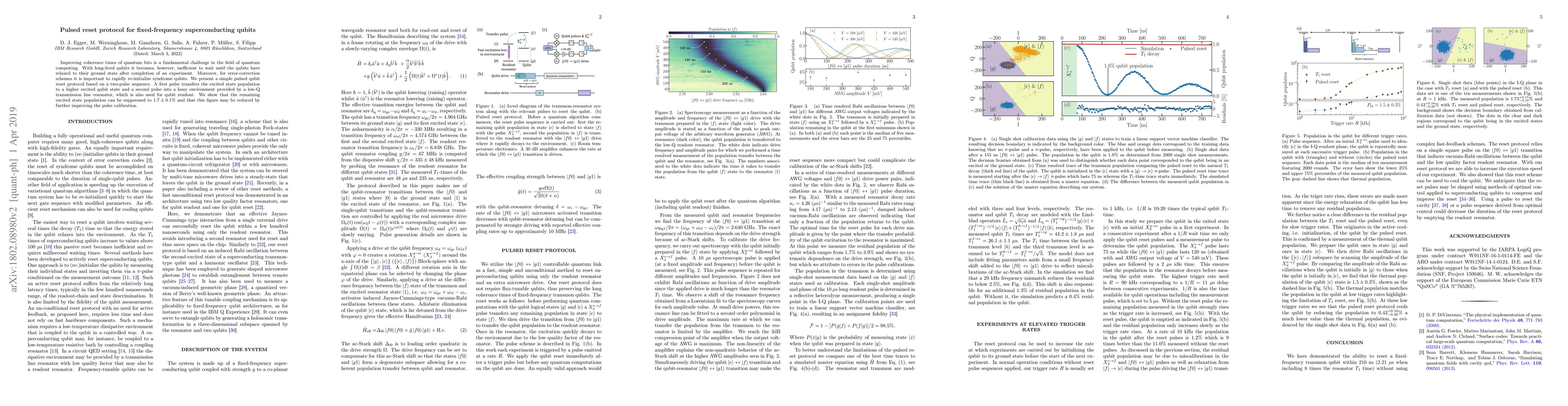 This paper proposes a pulsed reset protocol for fixed-frequency superconducting qubits to improve coherence times and enhance experiment rates by rapidly re-initializing qubits using a two-pulse sequence. The protocol suppresses remaining excited state population to $2.2\pm0.8\%$, facilitating faster quantum computing operations.