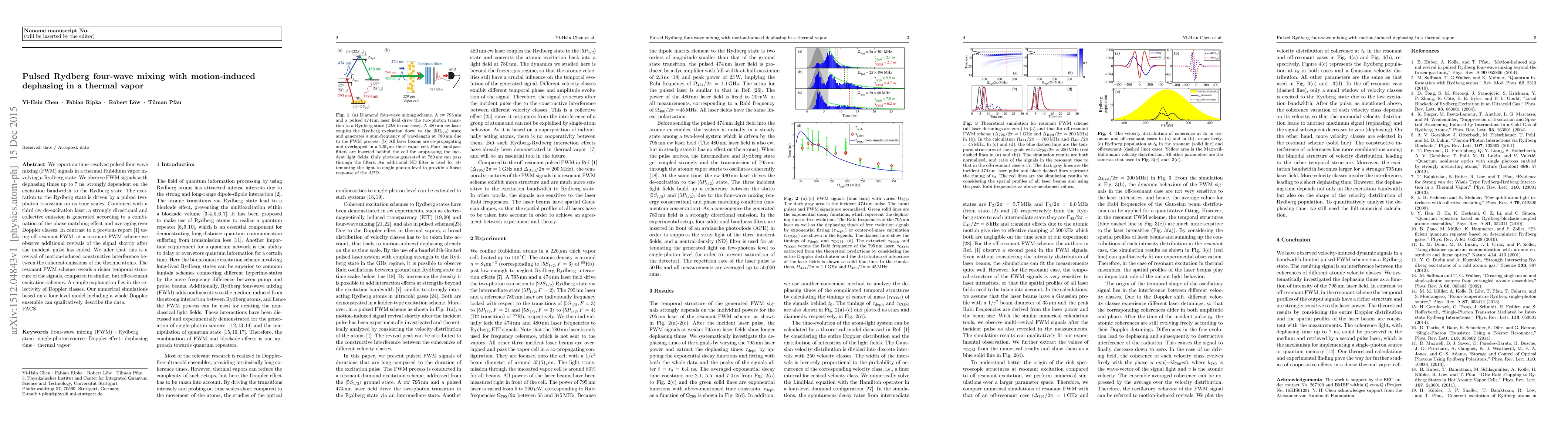 This paper reports on time-resolved pulsed four-wave mixing in a thermal Rubidium vapor involving Rydberg states, observing dephasing times up to 7 ns and revivals of the signal due to motion-induced constructive interference. The study highlights a richer temporal structure in resonant FWM compared to off-resonant schemes, explained by Doppler class selectivity.
