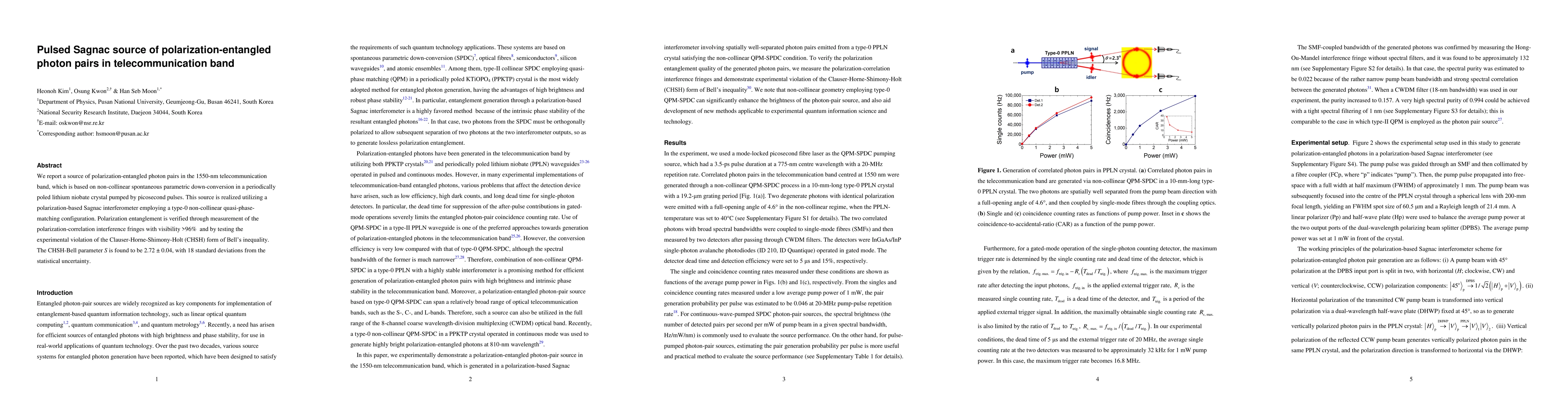 This paper presents a novel source of polarization-entangled photon pairs in the 1550-nm telecommunication band using non-collinear spontaneous parametric down-conversion in a periodically poled lithium niobate crystal. The source employs a polarization-based Sagnac interferometer, demonstrating high entanglement with a visibility of >96% and a strong violation of the CHSH Bell inequality.