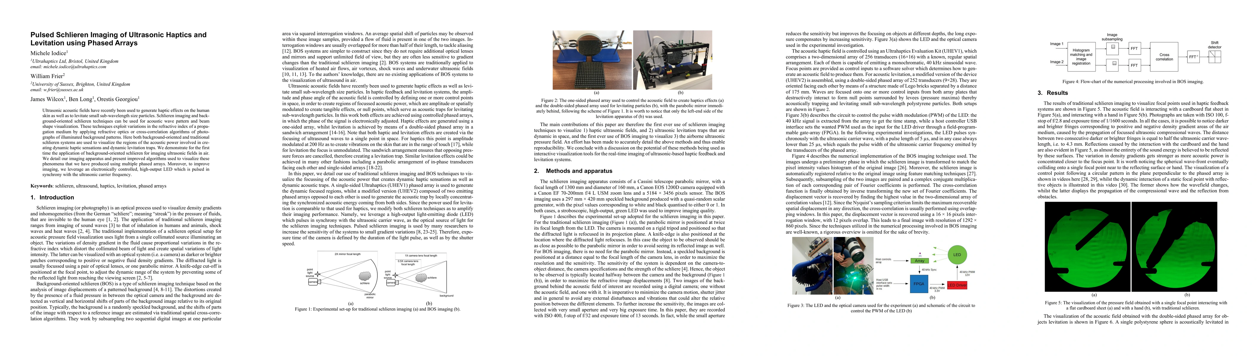 This paper presents the use of pulsed schlieren imaging to visualize ultrasonic fields generated by phased arrays for haptic effects and levitation. It introduces background-oriented schlieren techniques for the first time to image ultrasonic fields in air, employing improved algorithms and a synchronized high-output LED for enhanced visualization.