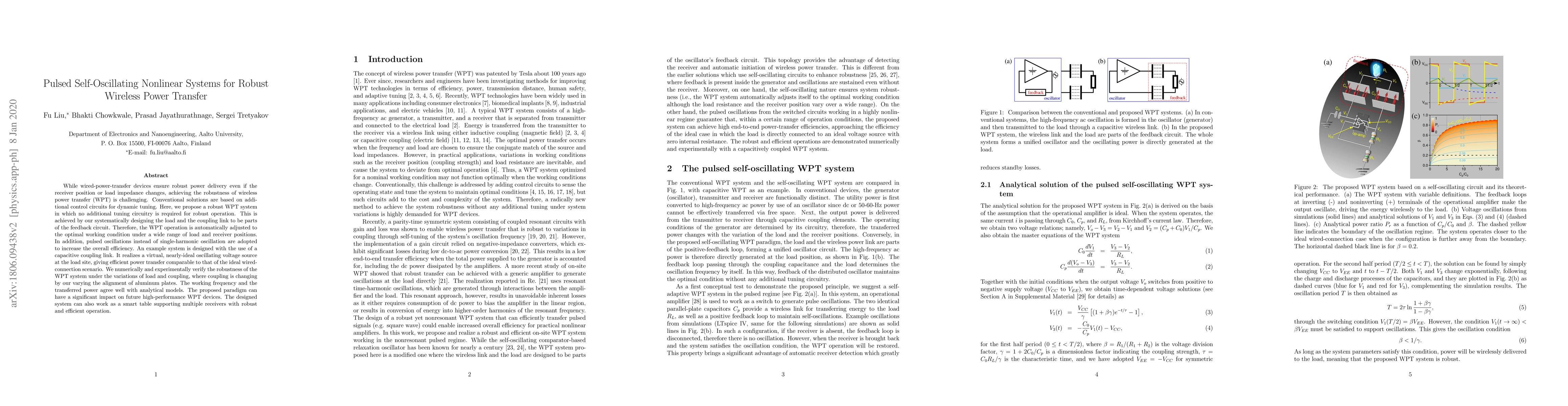 This paper proposes a novel robust wireless power transfer (WPT) system that eliminates the need for additional tuning circuits by integrating the load and coupling link into the feedback circuit. The use of pulsed self-oscillating nonlinear systems enhances efficiency and achieves optimal operation under varying load and receiver positions.