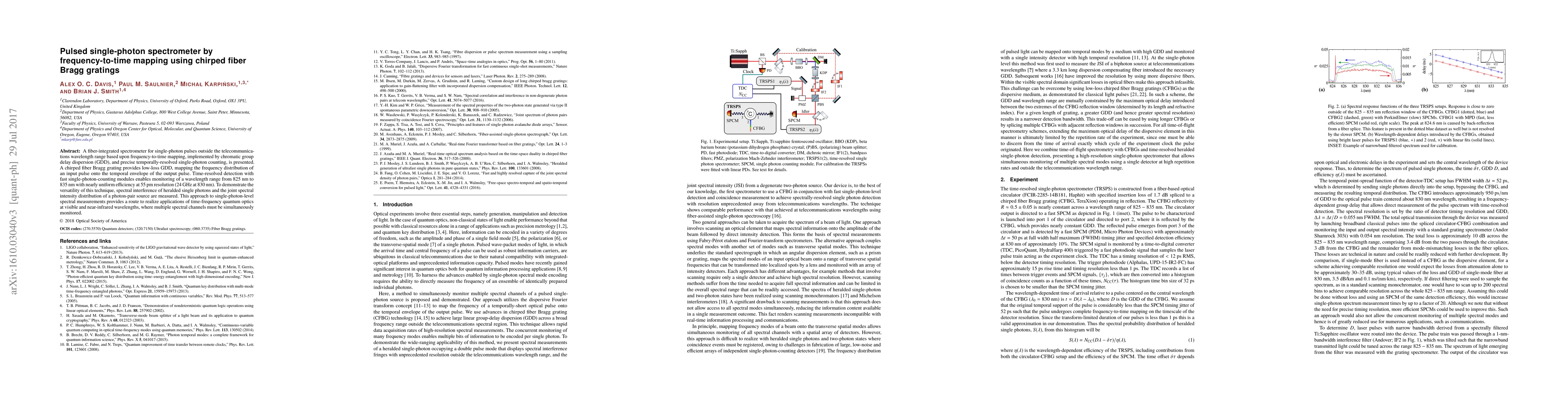 This paper presents a fiber-integrated spectrometer for single-photon pulses using chirped fiber Bragg gratings for frequency-to-time mapping, achieving high-resolution detection from 825 nm to 835 nm. The technique enables simultaneous monitoring of multiple spectral channels in quantum optics applications.