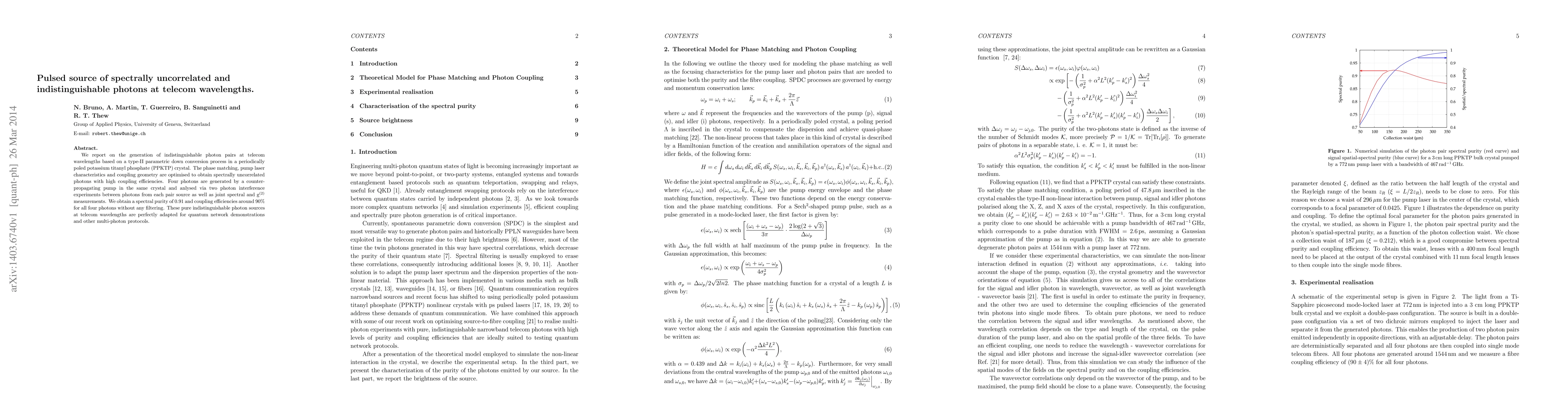 This paper details the generation of high-quality, indistinguishable photon pairs at telecom wavelengths via type-II parametric down conversion in a PPKTP crystal, achieving spectral purity of 0.91 and coupling efficiencies of 90% for four photons, suitable for quantum network applications.