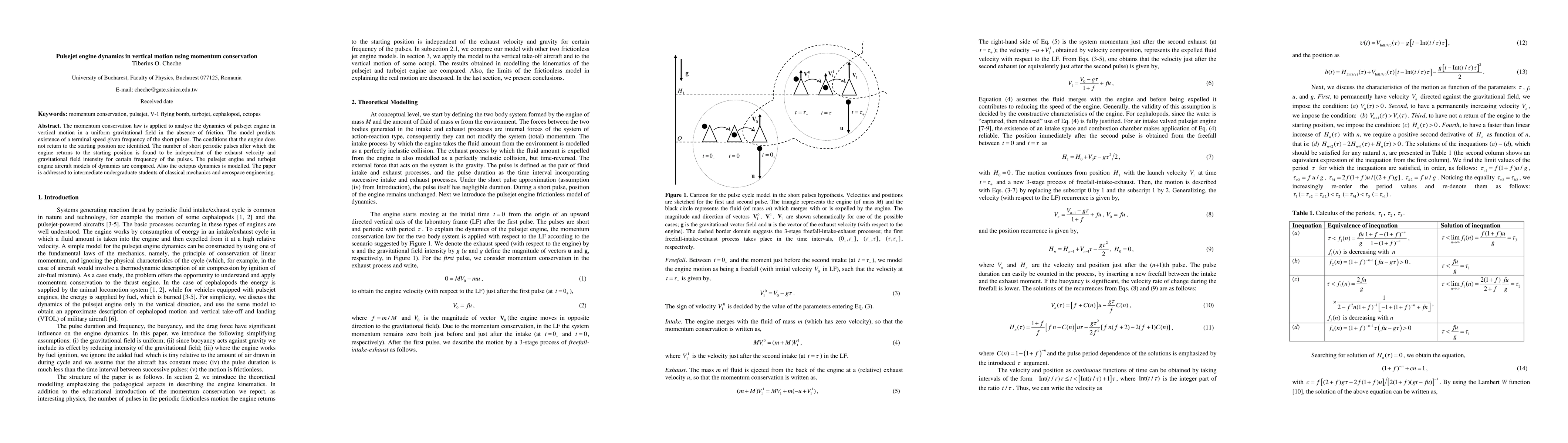The paper presents a detailed mathematical model of pulsejet engine dynamics in vertical motion using momentum conservation, identifying key parameters and conditions for engine behavior.