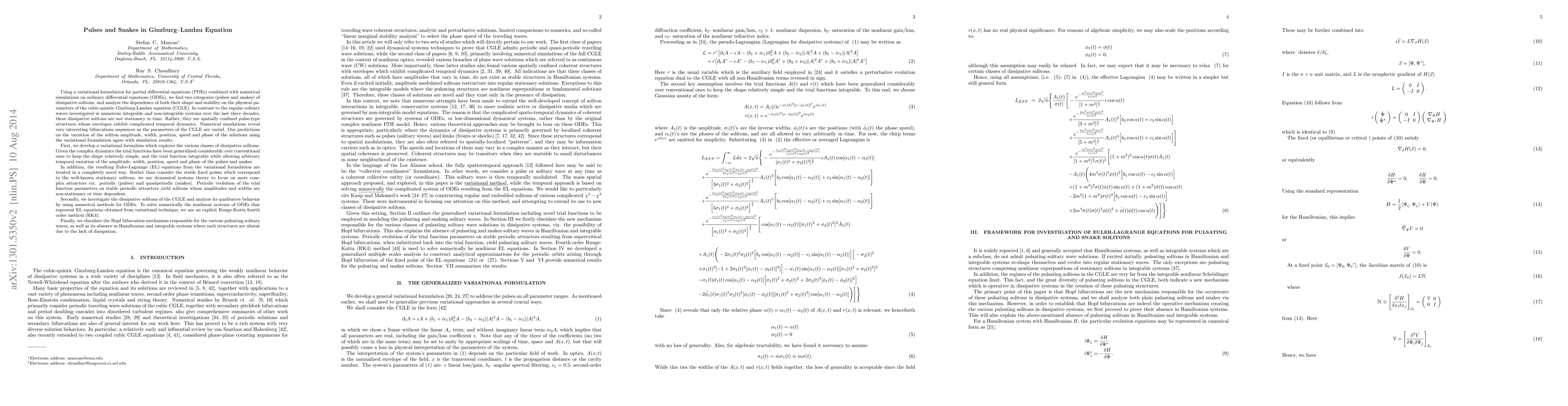 Using a variational formulation for partial differential equations (PDEs) combined with numerical simulations on ordinary differential equations (ODEs), we find two categories (pulses and snakes) of dissipative solitons, and analyze the dependence of both their shape and stability on the physical parameters of the cubic-quintic Ginzburg-Landau equation (CGLE). In contrast to the regular solitary waves investigated in numerous integrable and non-integrable systems over the last three decades, these dissipative solitons are not stationary in time. Rather, they are spatially confined pulse-type structures whose envelopes exhibit complicated temporal dynamics. Numerical simulations reveal very interesting bifurcations sequences as the parameters of the CGLE are varied. Our predictions on the variation of the soliton amplitude, width, position, speed and phase of the solutions using the variational formulation agree with simulation results.