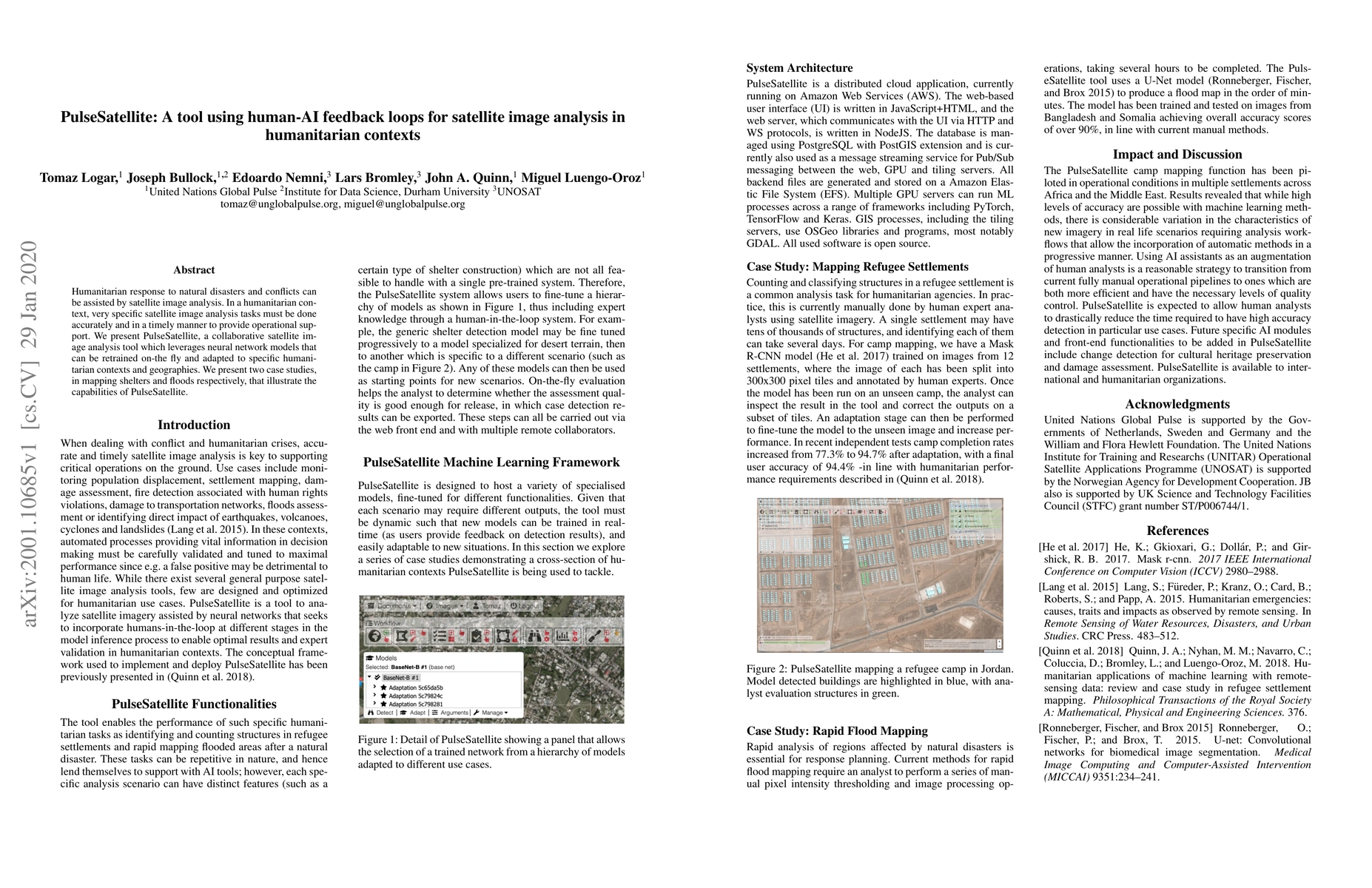PulseSatellite is a collaborative tool that integrates human-AI feedback loops to enhance satellite image analysis for humanitarian aid. It employs retrainable neural networks to adapt to specific disaster contexts, demonstrated through mapping shelters and floods in two case studies.