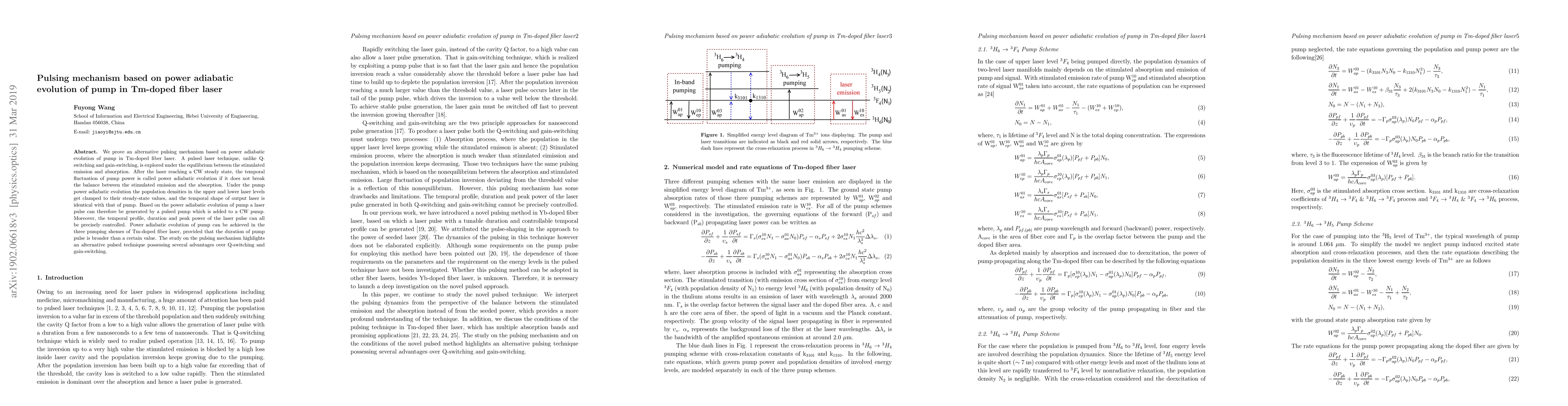 This paper explores a pulsing mechanism in Tm-doped fiber lasers based on power adiabatic evolution of the pump, generating laser pulses without disrupting the equilibrium between stimulated emission and absorption. This technique allows precise control over the temporal profile, duration, and peak power of the laser pulse, offering advantages over traditional Q-switching and gain-switching methods.