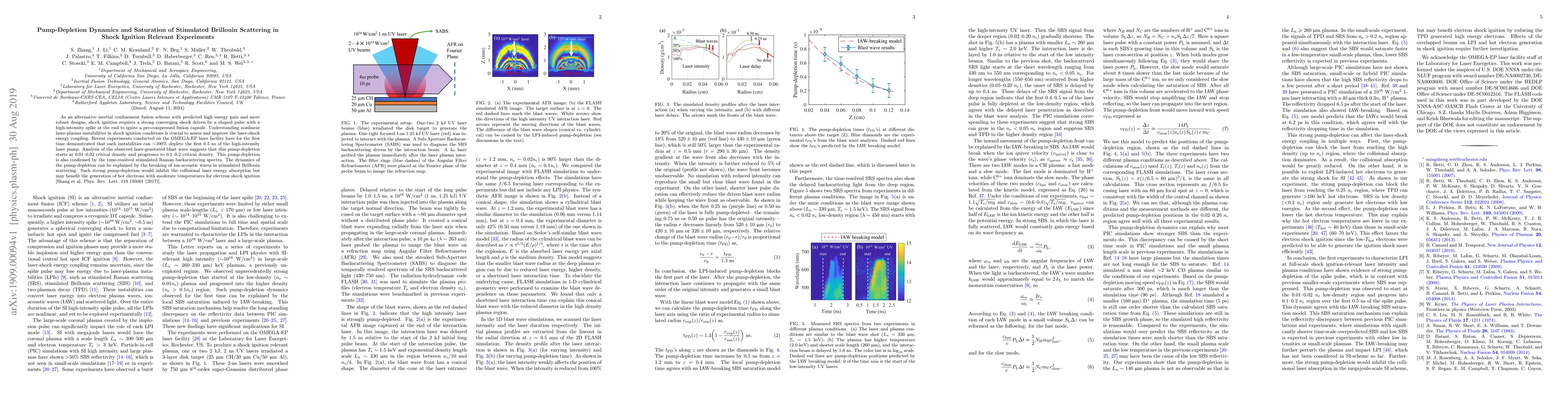 This paper investigates the pump-depletion dynamics and saturation of stimulated Brillouin scattering in shock ignition experiments, revealing that laser-plasma instabilities can deplete the first 0.5 ns of the high-intensity laser pulse. The depletion is linked to the breaking of ion-acoustic waves and may enhance hot electron generation for electron shock ignition.