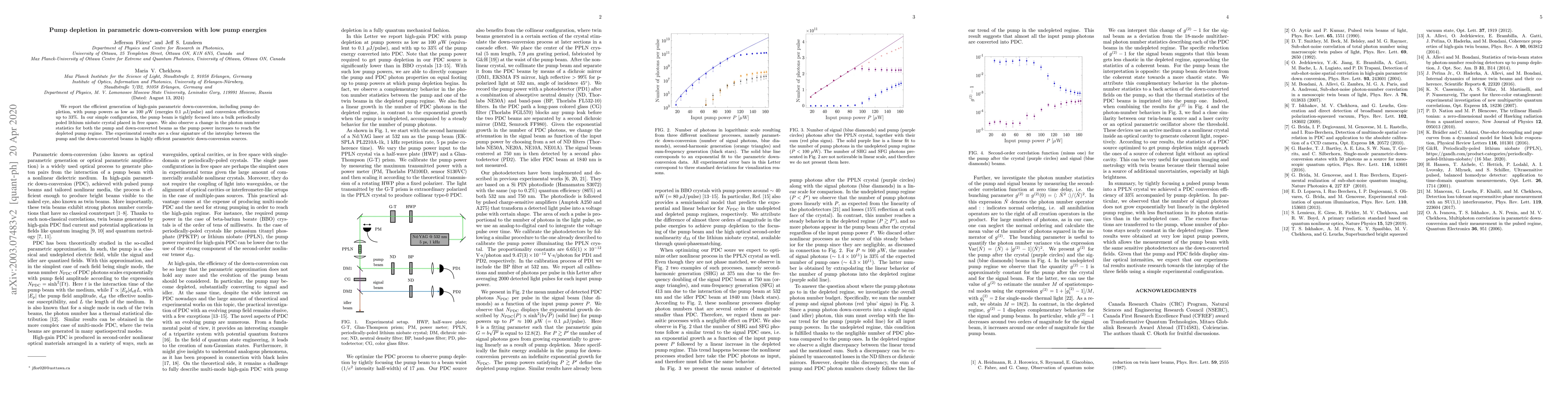 This paper reports efficient high-gain parametric down-conversion with pump depletion achieved using low pump energies of 100 $\mu$W, demonstrating conversion efficiencies up to 33%. The study highlights the transition in photon number statistics for both pump and down-converted beams as pump power increases, indicating the complex interaction between the beams in efficient parametric sources.