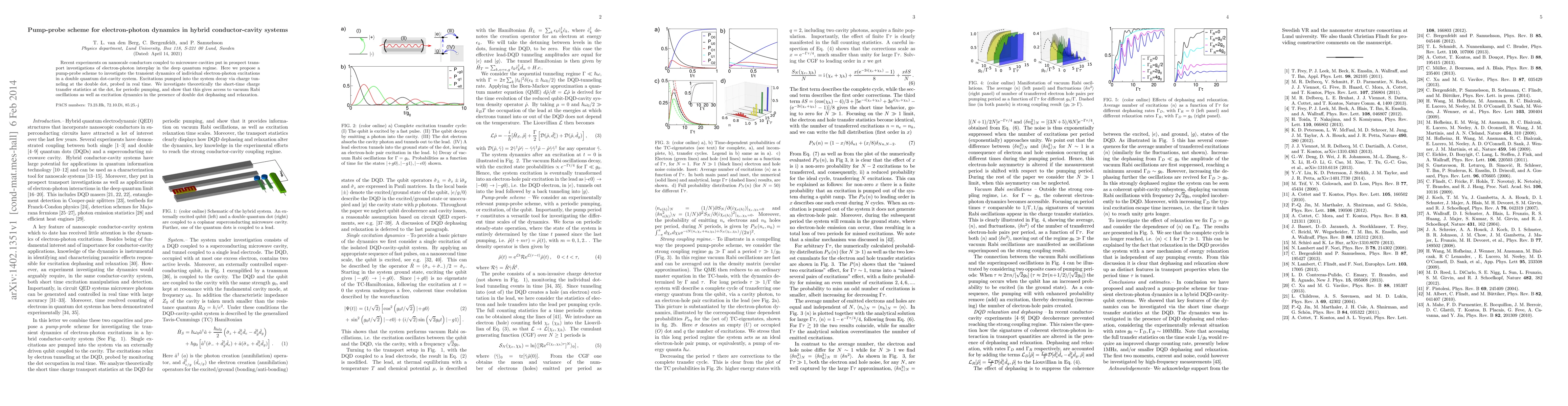 This paper proposes a pump-probe scheme for studying transient electron-photon dynamics in hybrid conductor-cavity systems, specifically focusing on a double quantum dot-cavity setup. Theoretical analysis reveals insights into charge transfer statistics, vacuum Rabi oscillations, and the effects of dephasing and relaxation.