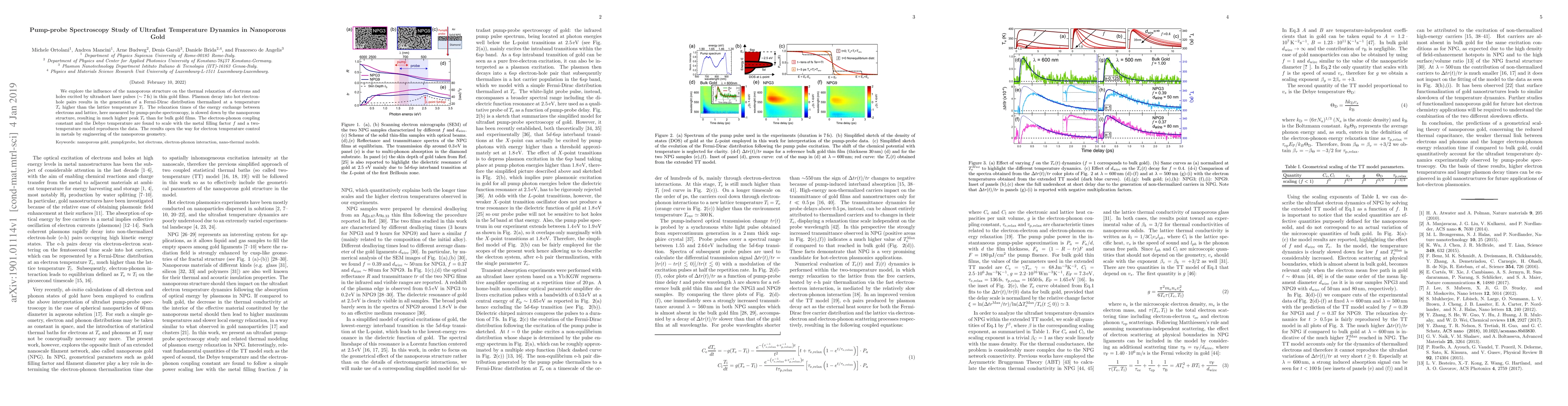 This paper investigates how nanoporous gold affects the ultrafast thermal relaxation of electrons and holes excited by femtosecond laser pulses. The study finds that the nanoporous structure significantly slows down the energy exchange between electrons and the lattice, leading to higher electron temperatures compared to bulk gold, suggesting potential for controlling electron temperature through nanoporous geometry design.