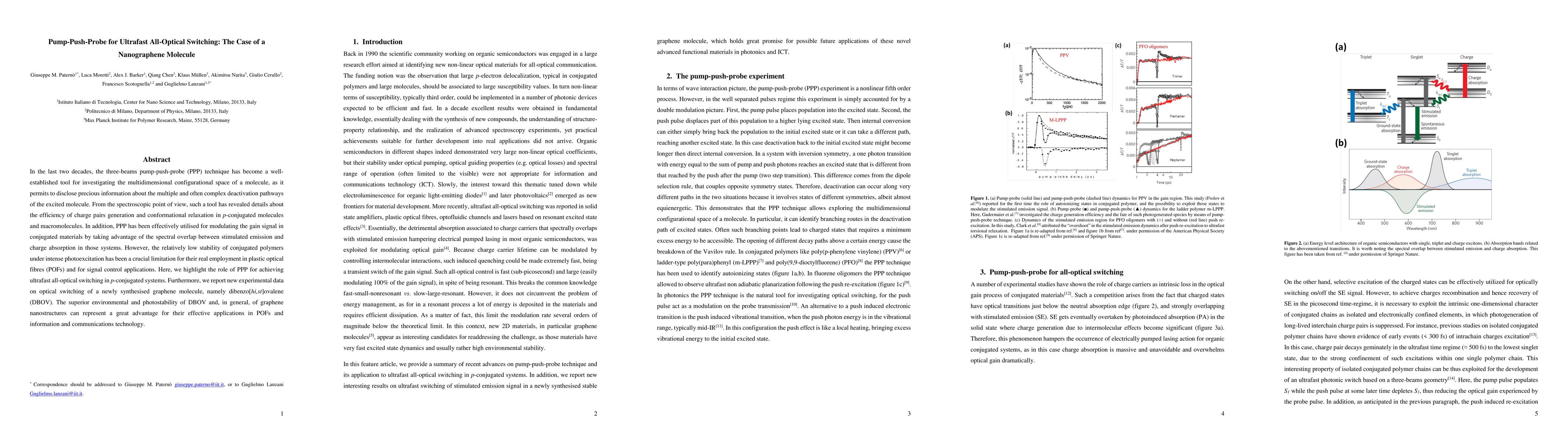 In the last two decades, the three-beams pump-push-probe (PPP) technique has become a well-established tool for investigating the multidimensional configurational space of a molecule, as it permits to disclose precious information about the multiple and often complex deactivation pathways of the excited molecule. From the spectroscopic point of view, such a tool has revealed details about the efficiency of charge pairs generation and conformational relaxation in p-conjugated molecules and macromolecules. In addition, PPP has been effectively utilised for modulating the gain signal in conjugated materials by taking advantage of the spectral overlap between stimulated emission and charge absorption in those systems. However, the relatively low stability of conjugated polymers under intense photoexcitation has been a crucial limitation for their real employment in plastic optical fibres (POFs) and for signal control applications. Here, we highlight the role of PPP for achieving ultrafast all-optical switching in p-conjugated systems. Furthermore, we report new experimental data on optical switching of a newly synthesised graphene molecule, namely dibenzo[hi,st]ovalene (DBOV). The superior environmental and photostability of DBOV and, in general, of graphene nanostructures can represent a great advantage for their effective applications in POFs and information and communications technology.