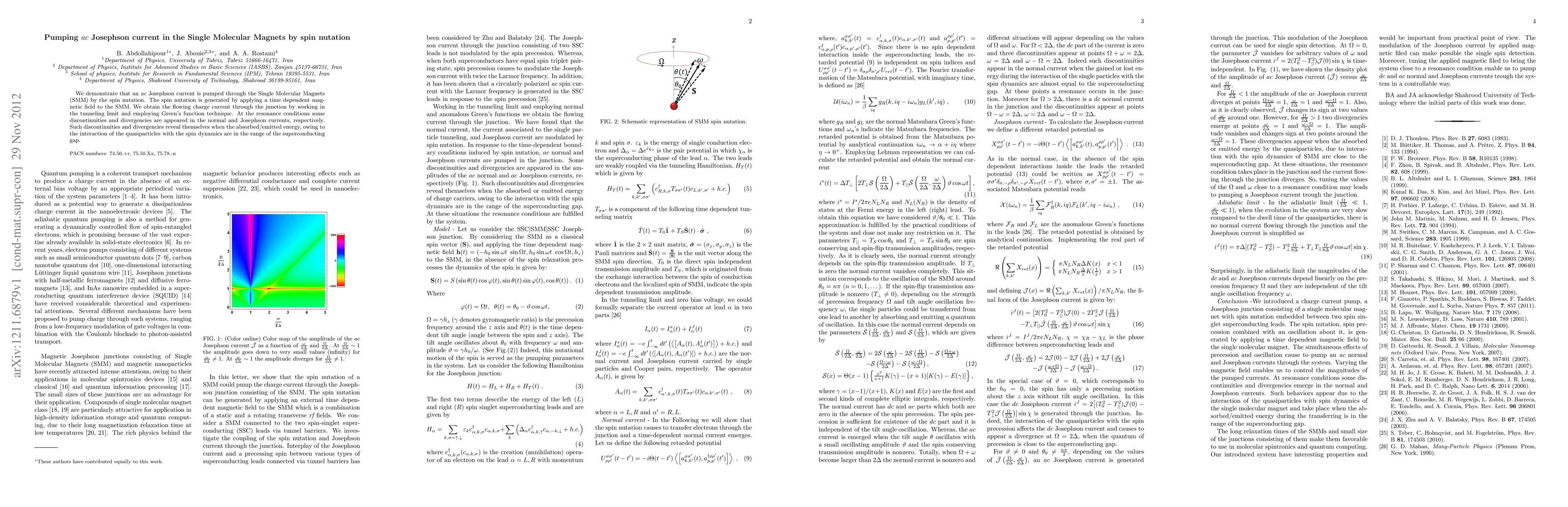 This paper demonstrates an {\it ac} Josephson current pumped through Single Molecular Magnets via spin nutation induced by a time-dependent magnetic field. The research uses tunneling and Green's function techniques to reveal discontinuities and divergencies in currents under resonance, indicating quasiparticle interactions with spin dynamics within the superconducting gap.