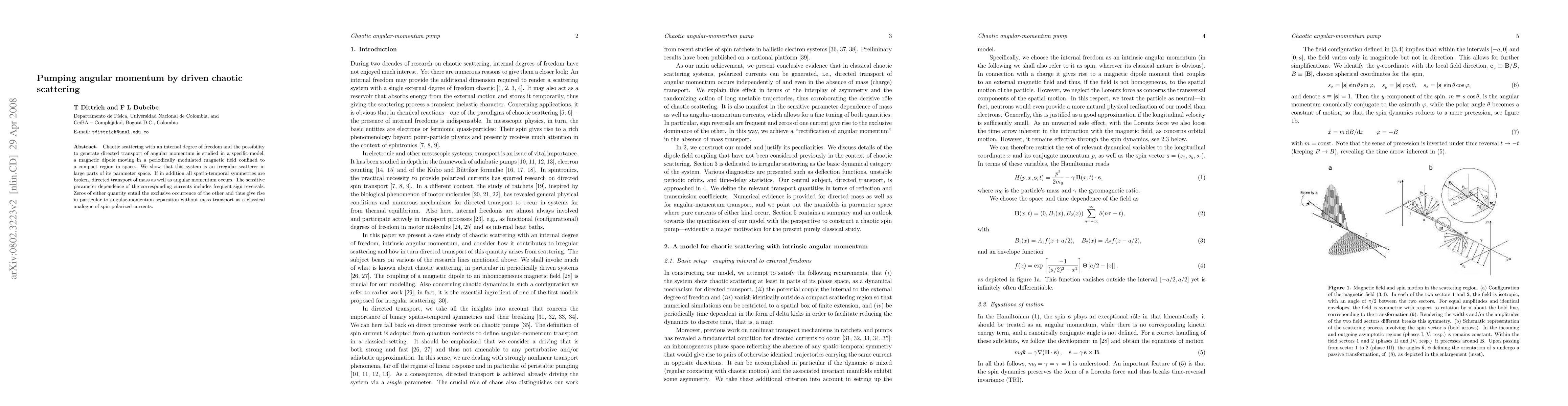 Chaotic scattering with an internal degree of freedom and the possibility to generate directed transport of angular momentum is studied in a specific model, a magnetic dipole moving in a periodically modulated magnetic field confined to a compact region in space. We show that this system is an irregular scatterer in large parts of its parameter space. If in addition all spatio-temporal symmetries are broken, directed transport of mass as well as angular momentum occurs. The sensitive parameter dependence of the corresponding currents includes frequent sign reversals. Zeros of either quantity entail the exclusive occurrence of the other and thus give rise in particular to angular-momentum separation without mass transport as a classical analogue of spin-polarized currents.