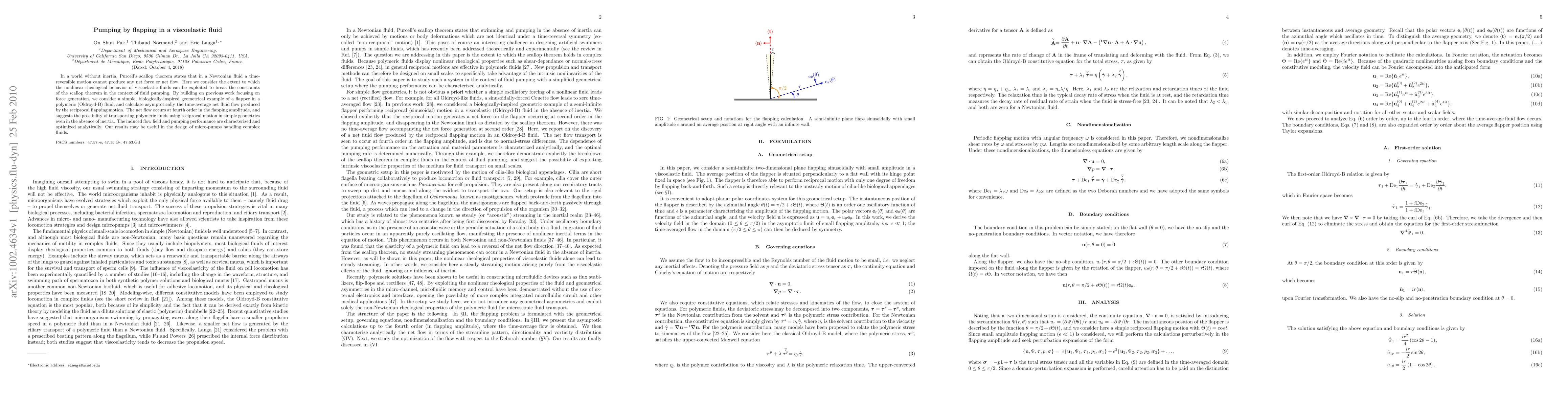 This paper explores how viscoelastic fluids can enable fluid pumping despite the constraints of Purcell's scallop theorem in a non-inertial environment. The study analytically calculates the net fluid flow generated by a flapping motion in an Oldroyd-B fluid, revealing that the flow occurs at a fourth-order amplitude, suggesting potential for micro-pump design for complex fluids.