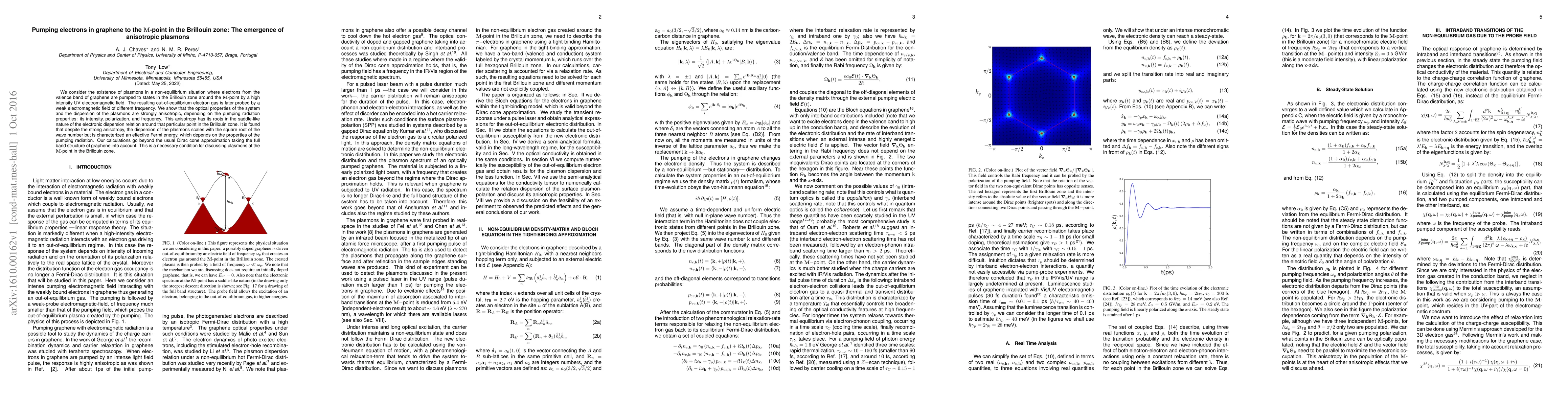 We consider the existence of plasmons in a non-equilibrium situation where electrons from the valence band of graphene are pumped to states in the Brillouin zone around the $\mathbf{M}$-point by a high intensity UV electromagnetic field. The resulting out-of-equilibrium electron gas is later probed by a weak electromagnetic field of different frequency. We show that the optical properties of the system and the dispersion of the plasmons are strongly anisotropic, depending on the pumping radiation properties: its intensity, polarization, and frequency. This anisotropy has its roots in the saddle-like nature of the electronic dispersion relation around that particular point in the Brillouin zone. It is found that despite the strong anisotropy, the dispersion of the plasmons scales with the square root of the wave number but is characterized an effective Fermi energy, which depends on the properties of the pumping radiation. Our calculations go beyond the usual Dirac cone approximation taking the full band structure of graphene into account. This is a necessary condition for discussing plasmons at the $\mathbf{M}$-point in the Brillouin zone.