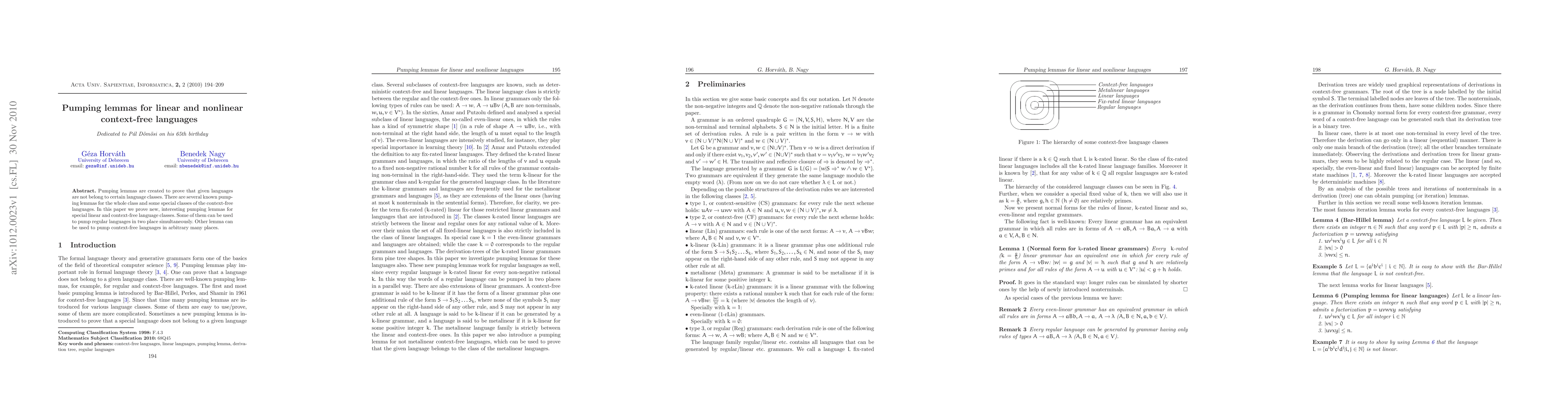 This paper introduces novel pumping lemmas for specific linear and nonlinear context-free language classes, enabling the demonstration of non-membership in these classes. Some lemmas allow simultaneous pumping in regular languages, while others enable pumping in context-free languages at multiple locations.