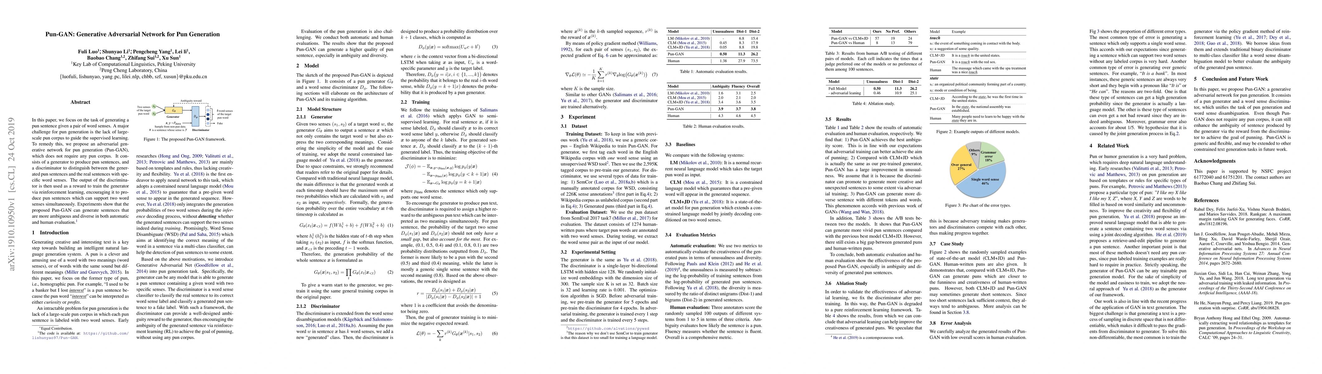 The Pun-GAN model generates pun sentences by leveraging a GAN framework without requiring a large pun corpus, using reinforcement learning to train the generator based on discriminator feedback. The results demonstrate increased ambiguity and diversity in generated pun sentences.