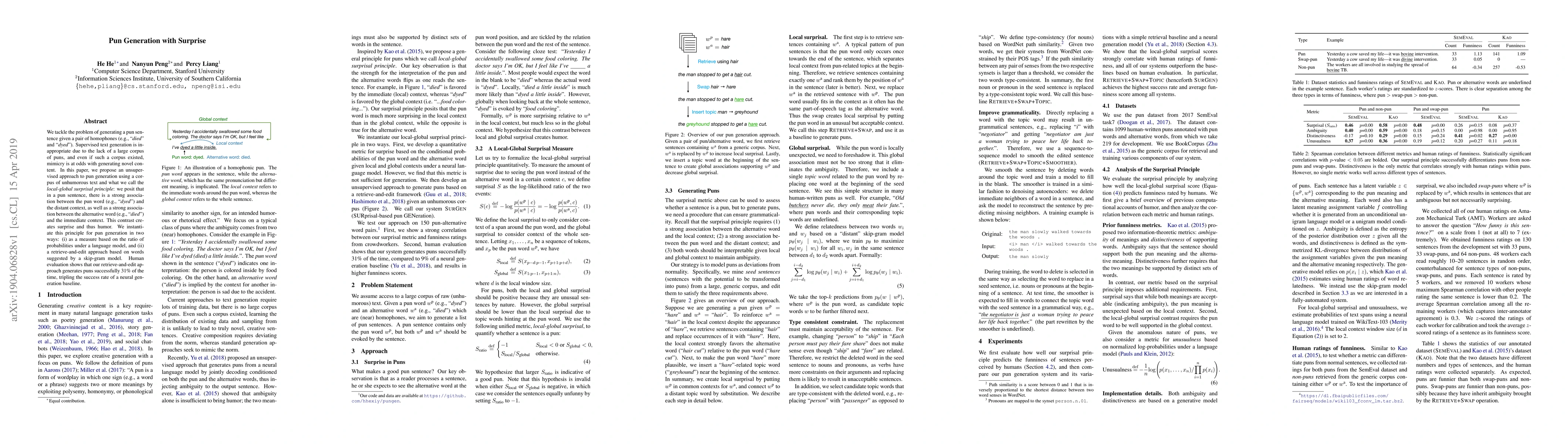 This paper proposes an unsupervised method for generating pun sentences using a corpus of unhumorous text and the local-global surprisal principle, which leverages associations between pun words and their contexts to create humor. The approach includes a probability ratio measure and a retrieve-and-edit method, with the latter achieving a 31% success rate in pun generation.