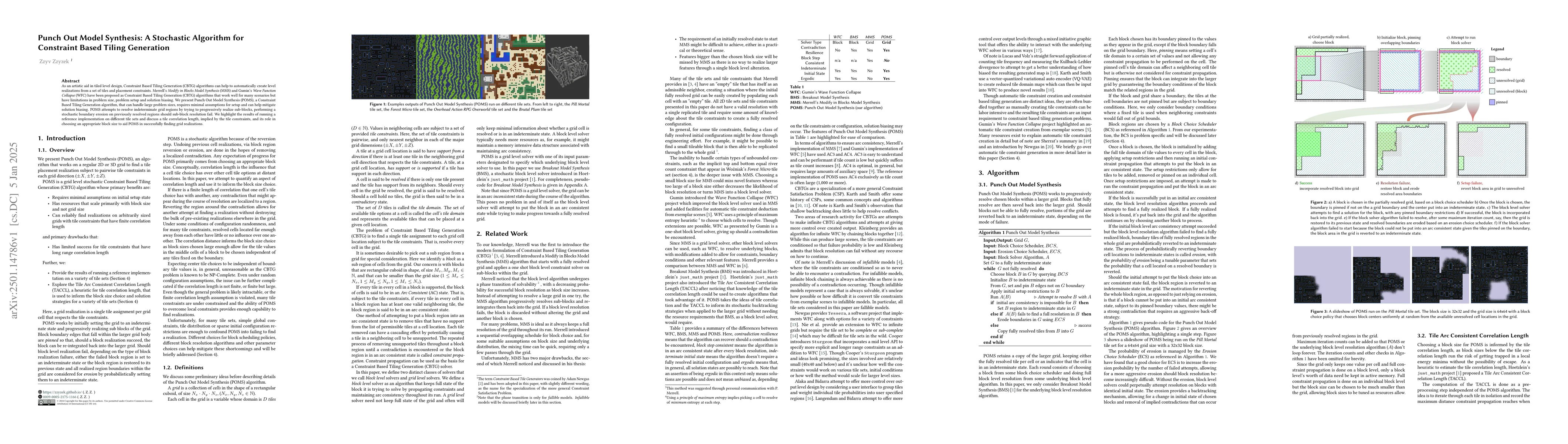 Punch Out Model Synthesis (POMS) is a novel stochastic algorithm for Constraint Based Tiling Generation, designed to tackle large-scale level design by progressively resolving sub-blocks and employing boundary erosion to address indeterminate grid regions, thus overcoming limitations of existing algorithms like MMS and WFC. The effectiveness of POMS is demonstrated through its implementation and analysis of different tile sets, emphasizing the importance of tile correlation length for optimal block size selection.