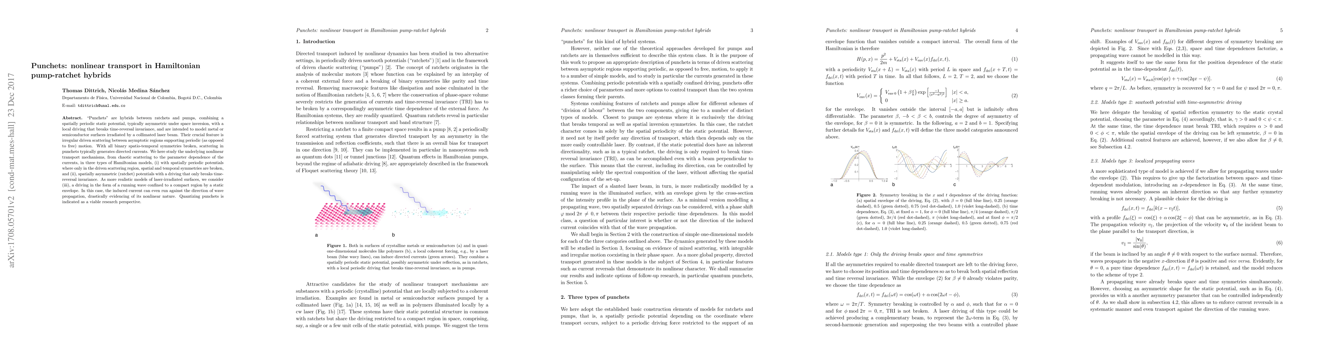The paper introduces 'punchets', hybrid systems combining ratchet and pump mechanisms to model laser-irradiated surfaces, exhibiting directed currents due to broken symmetries. It explores nonlinear transport in three Hamiltonian models, including a running wave driving that can create currents against wave propagation, suggesting quantization as a future research direction.