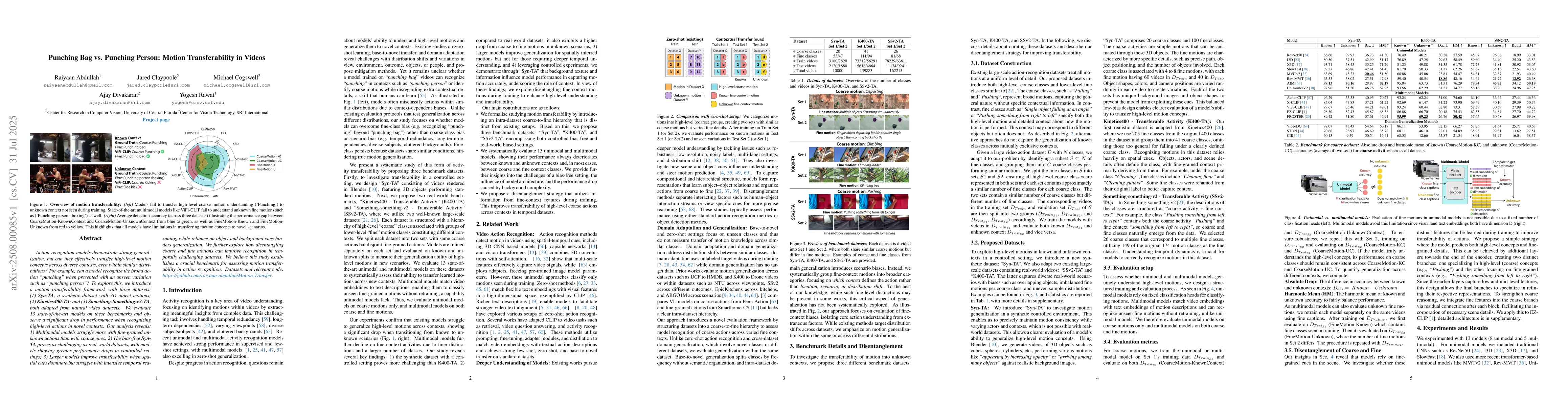 Action recognition models demonstrate strong generalization, but can they effectively transfer high-level motion concepts across diverse contexts, even within similar distributions? For example, can a model recognize the broad action "punching" when presented with an unseen variation such as "punching person"? To explore this, we introduce a motion transferability framework with three datasets: (1) Syn-TA, a synthetic dataset with 3D object motions; (2) Kinetics400-TA; and (3) Something-Something-v2-TA, both adapted from natural video datasets. We evaluate 13 state-of-the-art models on these benchmarks and observe a significant drop in performance when recognizing high-level actions in novel contexts. Our analysis reveals: 1) Multimodal models struggle more with fine-grained unknown actions than with coarse ones; 2) The bias-free Syn-TA proves as challenging as real-world datasets, with models showing greater performance drops in controlled settings; 3) Larger models improve transferability when spatial cues dominate but struggle with intensive temporal reasoning, while reliance on object and background cues hinders generalization. We further explore how disentangling coarse and fine motions can improve recognition in temporally challenging datasets. We believe this study establishes a crucial benchmark for assessing motion transferability in action recognition. Datasets and relevant code: https://github.com/raiyaan-abdullah/Motion-Transfer.
