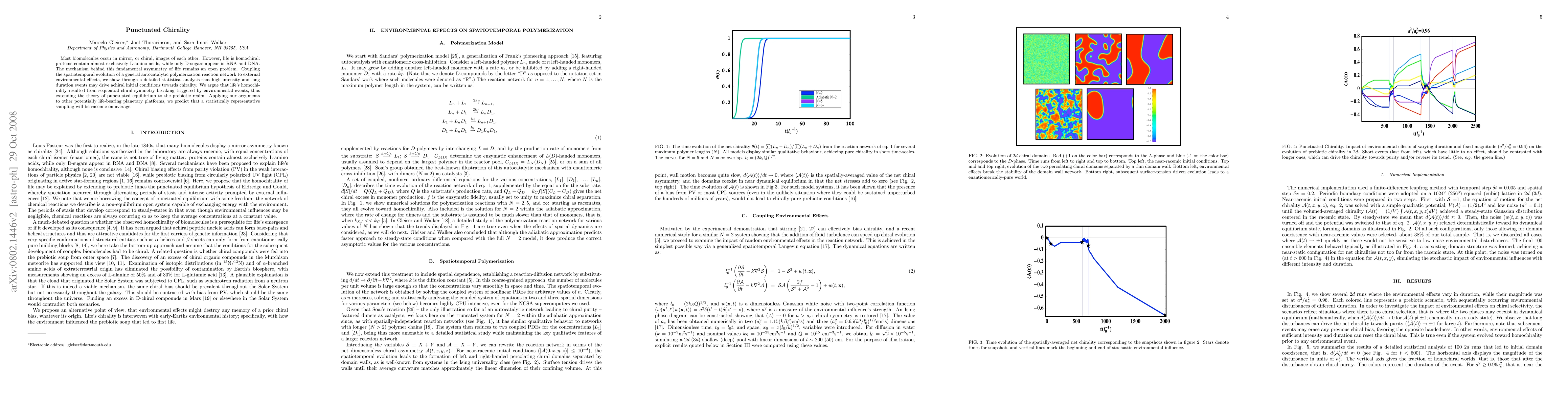 Most biomolecules occur in mirror, or chiral, images of each other. However, life is homochiral: proteins contain almost exclusively levorotatory (L) amino acids, while only dextrorotatory (R) sugars appear in RNA and DNA. The mechanism behind this fundamental asymmetry of life remains an open problem. Coupling the spatiotemporal evolution of a general autocatalytic polymerization reaction network to external environmental effects, we show through a detailed statistical analysis that high intensity and long duration events may drive achiral initial conditions towards chirality. We argue that life's homochirality resulted from sequential chiral symmetry breaking triggered by environmental events, thus extending the theory of punctuated equilibrium to the prebiotic realm. Applying our arguments to other potentially life-bearing planetary platforms, we predict that a statistically representative sampling will be racemic on average.