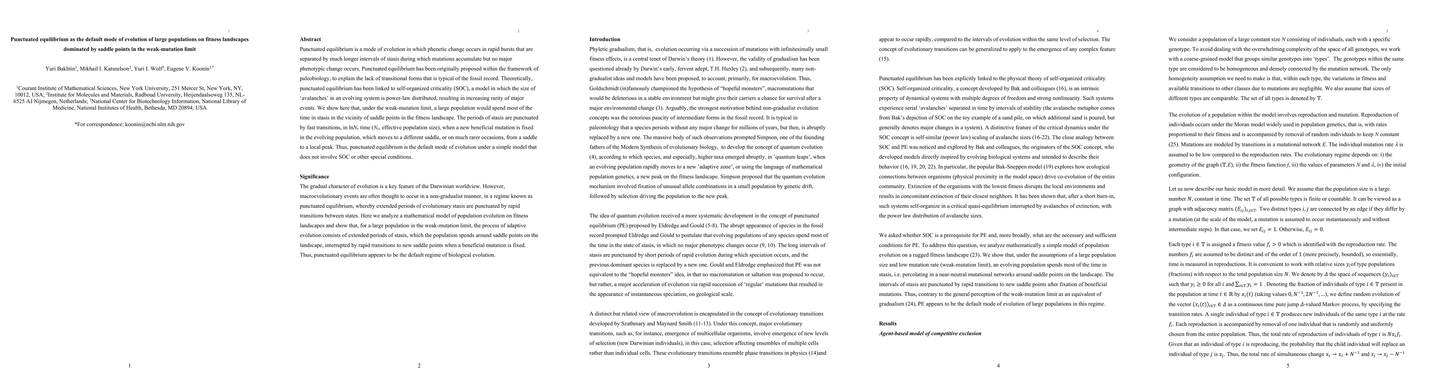 This paper argues that punctuated equilibrium is the default evolutionary mode for large populations in weak-mutation scenarios, characterized by long periods of stasis punctuated by rapid bursts of phenetic change when beneficial mutations are fixed, often moving populations to new fitness landscape saddle points.