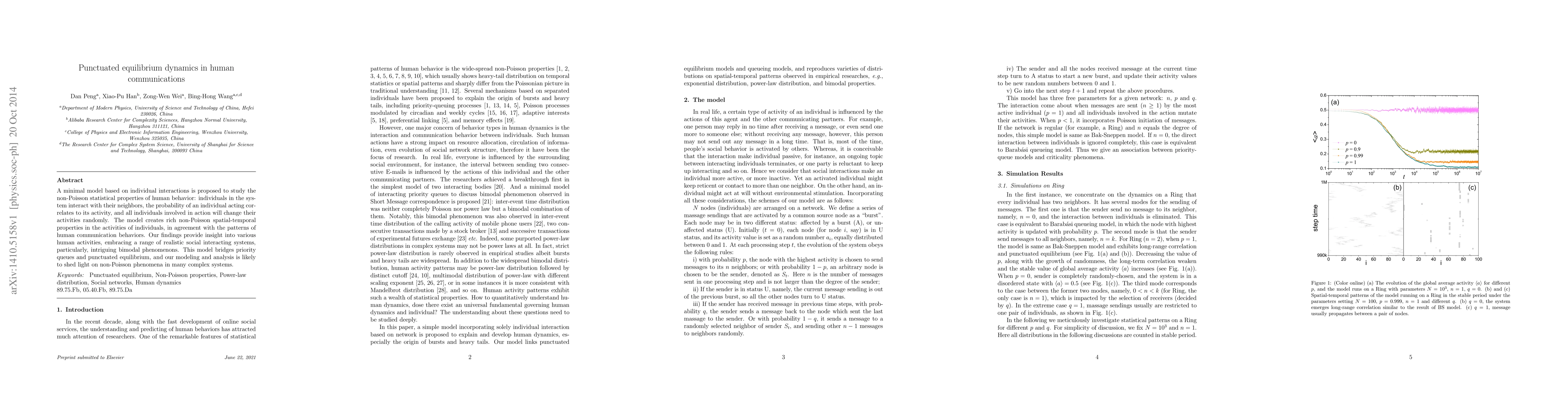A minimal model based on individual interactions is proposed to study the non-Poisson statistical properties of human behavior: individuals in the system interact with their neighbors, the probability of an individual acting correlates to its activity, and all individuals involved in action will change their activities randomly. The model creates rich non-Poisson spatial-temporal properties in the activities of individuals, in agreement with the patterns of human communication behaviors. Our findings provide insight into various human activities, embracing a range of realistic social interacting systems, particularly, intriguing bimodal phenomenons. This model bridges priority queues and punctuated equilibrium, and our modeling and analysis is likely to shed light on non-Poisson phenomena in many complex systems.