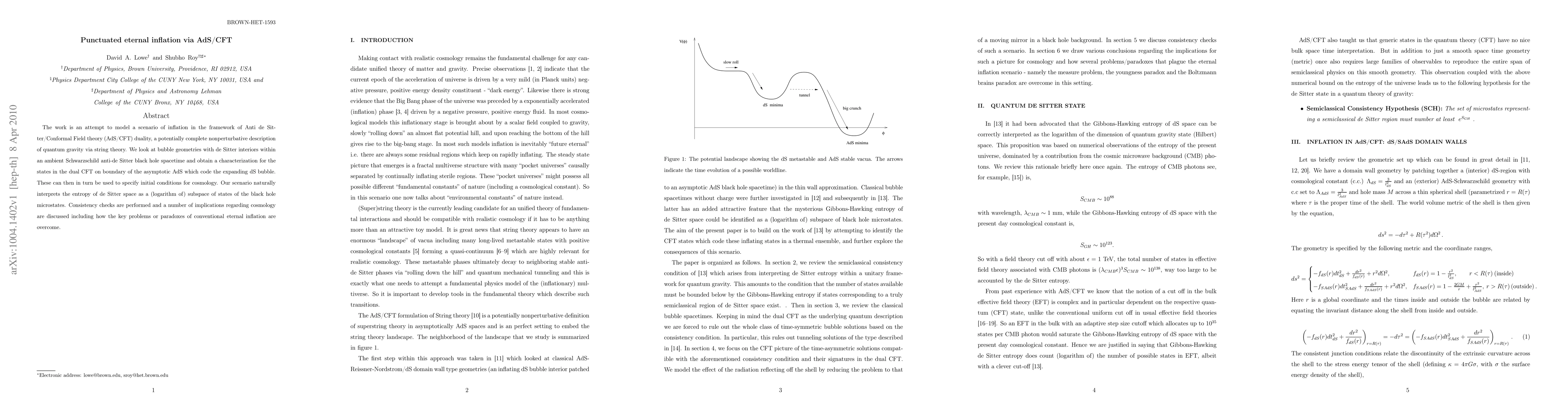 This paper models punctuated eternal inflation using AdS/CFT duality, exploring bubble geometries within a Schwarzschild-AdS spacetime to characterize states in the dual CFT that represent expanding dS bubbles. It addresses cosmology's initial conditions and resolves paradoxes of conventional eternal inflation.