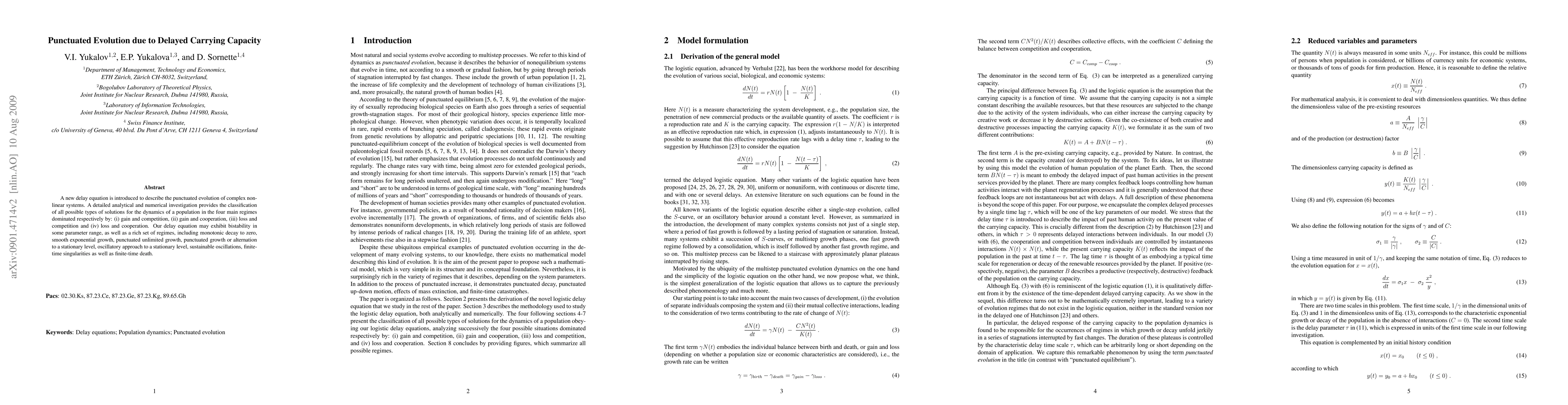 A new delay equation is introduced to describe the punctuated evolution of complex nonlinear systems. A detailed analytical and numerical investigation provides the classification of all possible types of solutions for the dynamics of a population in the four main regimes dominated respectively by: (i) gain and competition, (ii) gain and cooperation, (iii) loss and competition and (iv) loss and cooperation. Our delay equation may exhibit bistability in some parameter range, as well as a rich set of regimes, including monotonic decay to zero, smooth exponential growth, punctuated unlimited growth, punctuated growth or alternation to a stationary level, oscillatory approach to a stationary level, sustainable oscillations, finite-time singularities as well as finite-time death.