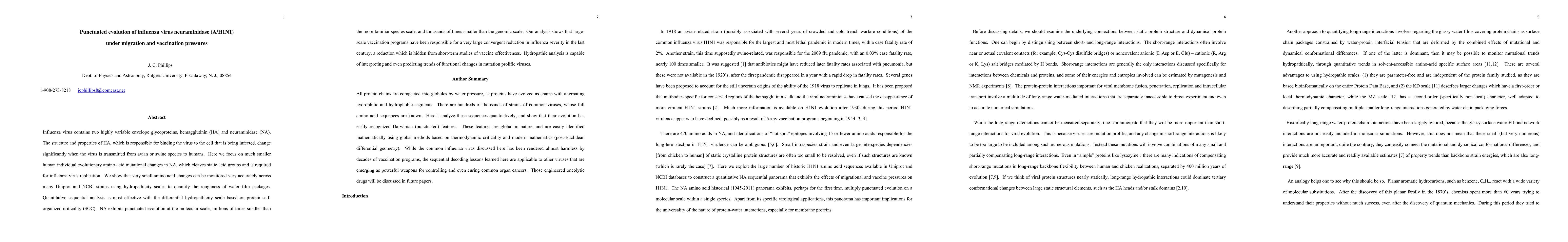 Influenza virus contains two highly variable envelope glycoproteins, hemagglutinin (HA) and neuraminidase (NA). The structure and properties of HA, which is responsible for binding the virus to the cell that is being infected, change significantly when the virus is transmitted from avian or swine species to humans. Here we focus on much smaller human individual evolutionary amino acid mutational changes in NA, which cleaves sialic acid groups and is required for influenza virus replication. We show that very small amino acid changes can be monitored very accurately across many Uniprot and NCBI strains using hydropathicity scales to quantify the roughness of water film packages. Quantitative sequential analysis is most effective with the differential hydropathicity scale based on protein self-organized criticality (SOC). NA exhibits punctuated evolution at the molecular scale, millions of times smaller than the more familiar species scale, and thousands of times smaller than the genomic scale. Our analysis shows that large-scale vaccination programs have been responsible for a very large convergent reduction in influenza severity in the last century, a reduction which is hidden from short-term studies of vaccine effectiveness. Hydropathic analysis is capable of interpreting and even predicting trends of functional changes in mutation prolific viruses.