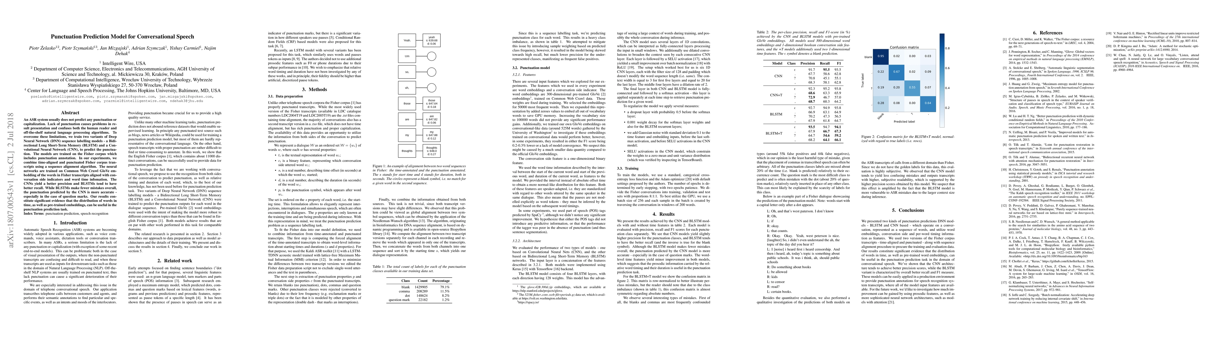 This research explores the development of Deep Neural Network models, specifically Bidirectional Long Short-Term Memory (BLSTM) and Convolutional Neural Network (CNN), to predict punctuation in conversational speech. The study demonstrates that while BLSTMs have better recall, CNNs achieve higher precision, particularly in predicting question marks, suggesting that word distribution over time and pre-trained embeddings are valuable for improving punctuation prediction.
