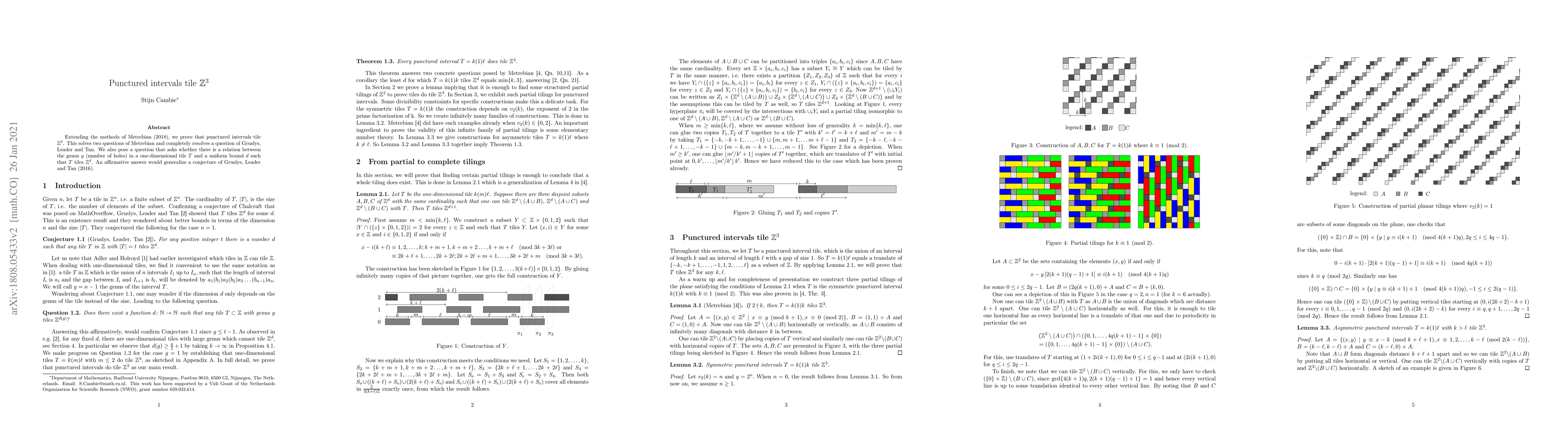 Extending the methods of Metrebian (2018), we prove that any symmetric punctured interval tiles $\mathbb Z^3$. This solves two questions of Metrebian and completely resolves a question of Gruslys, Leader and Tan. We also pose a question that asks whether there is a relation between the genus $g$ (number of holes) in a one-dimensional tile $T$ and a uniform bound $d$ such that $T$ tiles $\mathbb{Z}^d$. An affirmative answer would generalize a conjecture of Gruslys, Leader and Tan (2016).