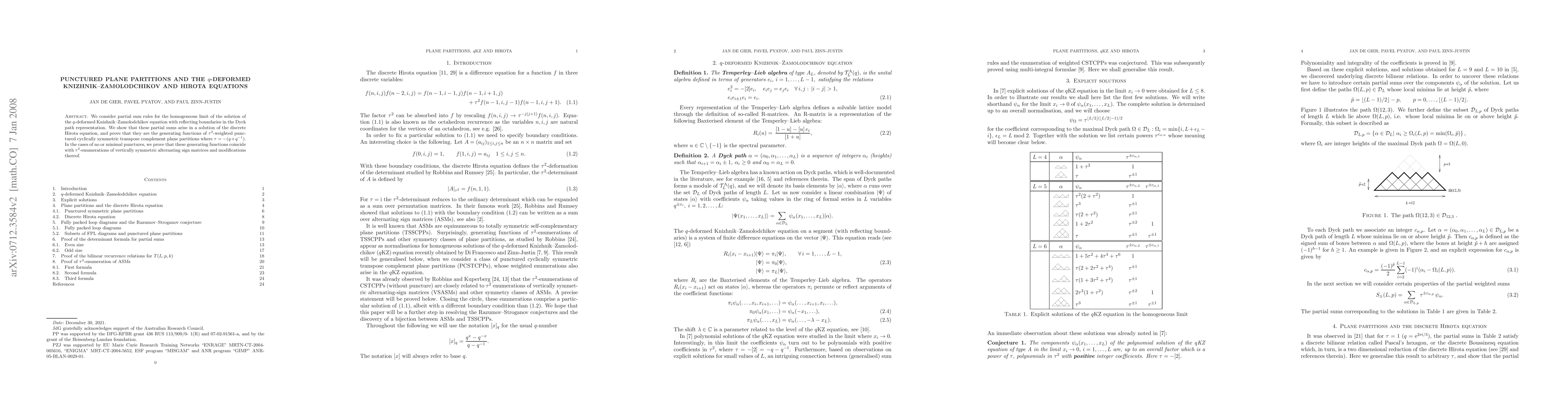 We consider partial sum rules for the homogeneous limit of the solution of the q-deformed Knizhnik--Zamolodchikov equation with reflecting boundaries in the Dyck path representation. We show that these partial sums arise in a solution of the discrete Hirota equation, and prove that they are the generating functions of $\tau^2$-weighted punctured cyclically symmetric transpose complement plane partitions where $\tau=-(q+q^{-1})$. In the cases of no or minimal punctures, we prove that these generating functions coincide with $\tau^2$-enumerations of vertically symmetric alternating sign matrices and modifications thereof.