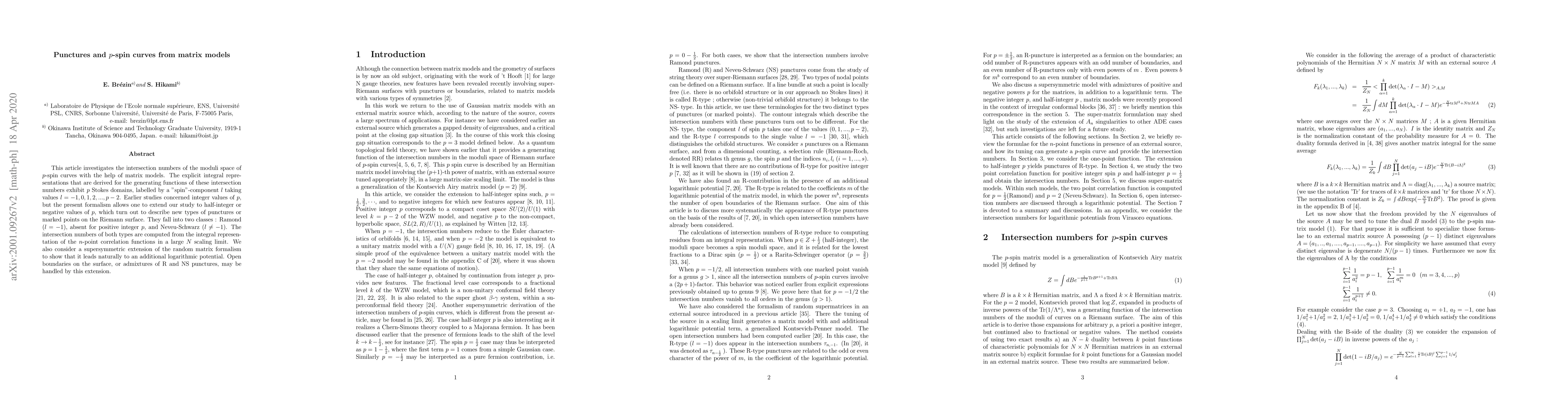 This article investigates the intersection numbers of the moduli space of p-spin curves with the help of matrix models. The explicit integral representations that are derived for the generating functions of these intersection numbers exhibit p Stokes domains, labelled by a "spin"-component l taking values l = -1, 0,1,2,...,p-2. Earlier studies concerned integer values of p, but the present formalism allows one to extend our study to half-integer or negative values of p, which turn out to describe new types of punctures or marked points on the Riemann surface. They fall into two classes : Ramond (l=-1), absent for positive integer p, and Neveu-Schwarz (l\ne -1). The intersection numbers of both types are computed from the integral representation of the n-point correlation functions in a large N scaling limit. We also consider a supersymmetric extension of the random matrix formalism to show that it leads naturally to an additional logarithmic potential. Open boundaries on the surface, or admixtures of R and NS punctures, may be handled by this extension.