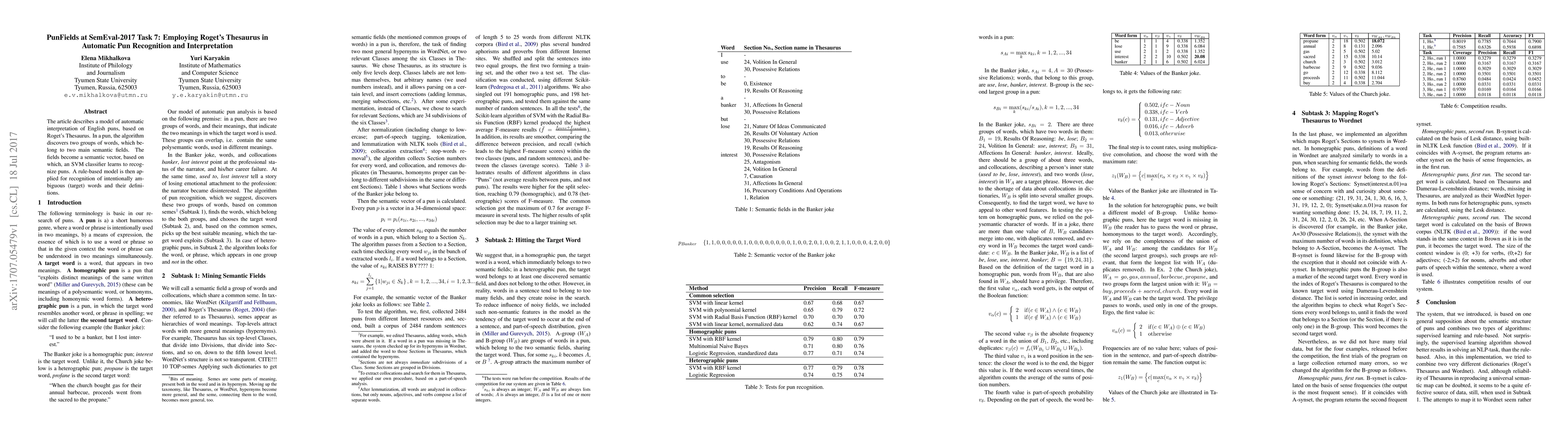 The paper presents PunFields, an automatic model for pun recognition using Roget's Thesaurus, which identifies semantic fields to classify puns via an SVM classifier. While PunFields performs well in SemEval-2017 Task 7, it needs enhancements in pinpointing the target ambiguous words and their definitions.