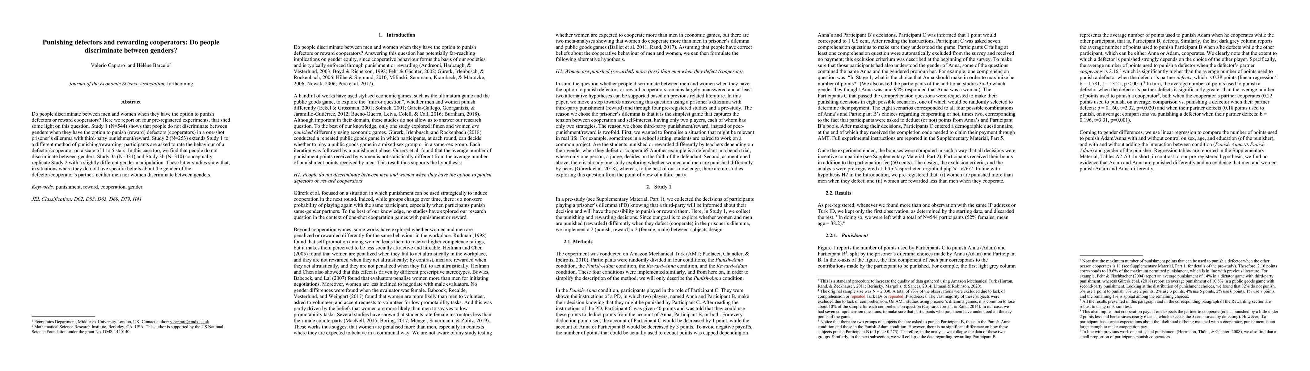 Four pre-registered experiments reveal that people do not discriminate between genders when punishing defectors or rewarding cooperators in various social dilemma settings. Results across different methods consistently show no gender-based discrimination in these behaviors.