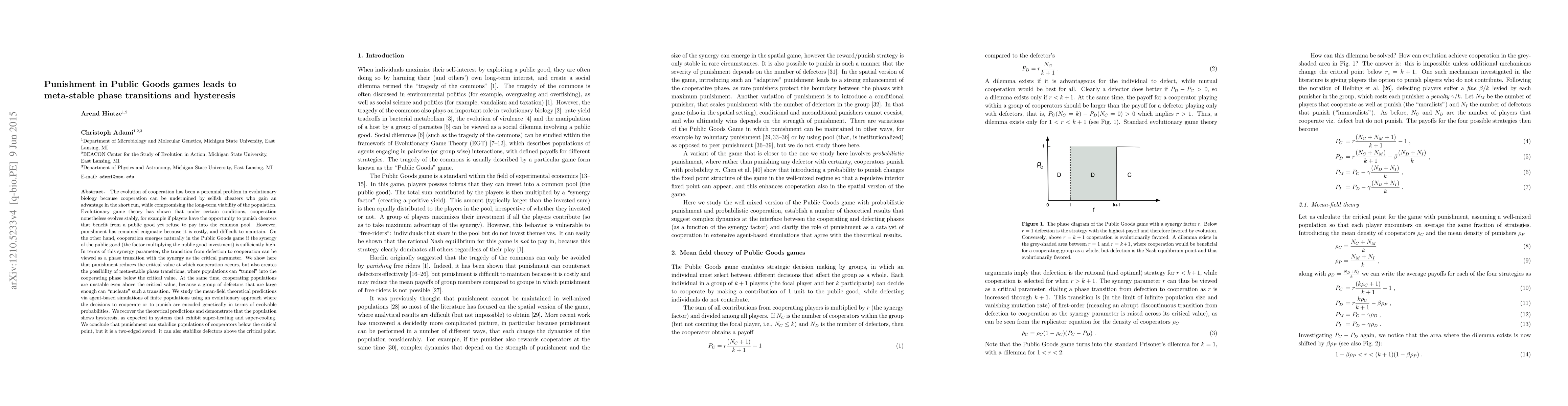This paper explores how punishment in Public Goods games can lead to meta-stable phase transitions and hysteresis, demonstrating that while punishment can stabilize cooperation below the critical synergy level, it also risks stabilizing defectors above it, thus creating a complex dynamic in cooperative evolution.