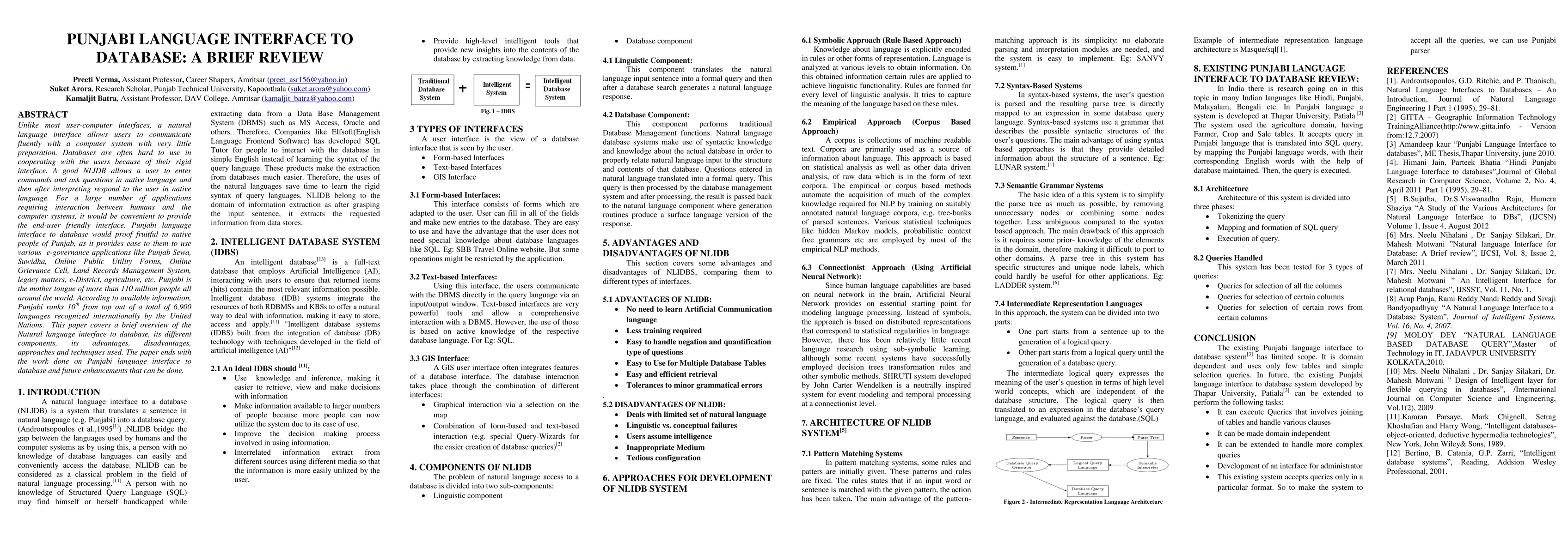Unlike most user-computer interfaces, a natural language interface allows users to communicate fluently with a computer system with very little preparation. Databases are often hard to use in cooperating with the users because of their rigid interface. A good NLIDB allows a user to enter commands and ask questions in native language and then after interpreting respond to the user in native language. For a large number of applications requiring interaction between humans and the computer systems, it would be convenient to provide the end-user friendly interface. Punjabi language interface to database would proof fruitful to native people of Punjab, as it provides ease to them to use various e-governance applications like Punjab Sewa, Suwidha, Online Public Utility Forms, Online Grievance Cell, Land Records Management System,legacy matters, e-District, agriculture, etc. Punjabi is the mother tongue of more than 110 million people all around the world. According to available information, Punjabi ranks 10th from top out of a total of 6,900 languages recognized internationally by the United Nations. This paper covers a brief overview of the Natural language interface to database, its different components, its advantages, disadvantages, approaches and techniques used. The paper ends with the work done on Punjabi language interface to database and future enhancements that can be done.