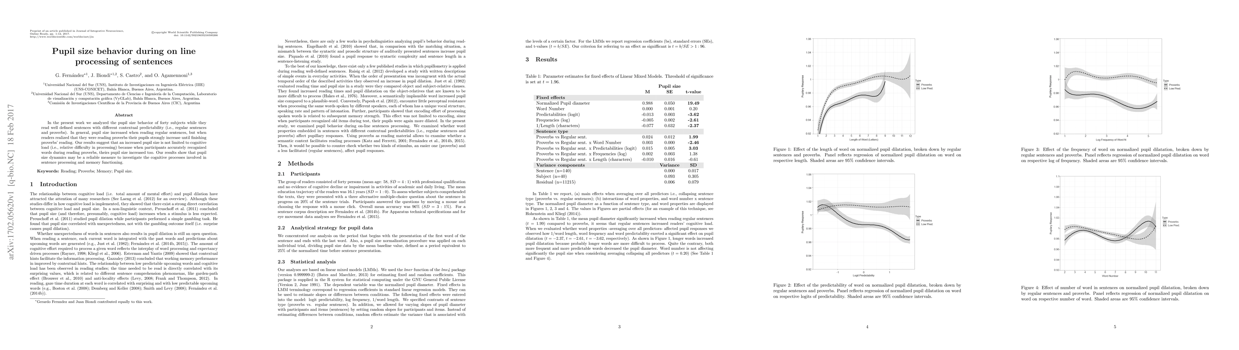 In the present work we analyzed the pupil size behavior of forty subjects while they read well defined sentences with different contextual predictability (i.e., regular sentences and proverbs). In general, pupil size increased when reading regular sentences, but when readers realized that they were reading proverbs their pupils strongly increase until finishing proverbs' reading. Our results suggest that an increased pupil size is not limited to cognitive load (i.e., relative difficulty in processing) because when participants accurately recognized words during reading proverbs, theirs pupil size increased too. Our results show that pupil size dynamics may be a reliable measure to investigate the cognitive processes involved in sentence processing and memory functioning.
