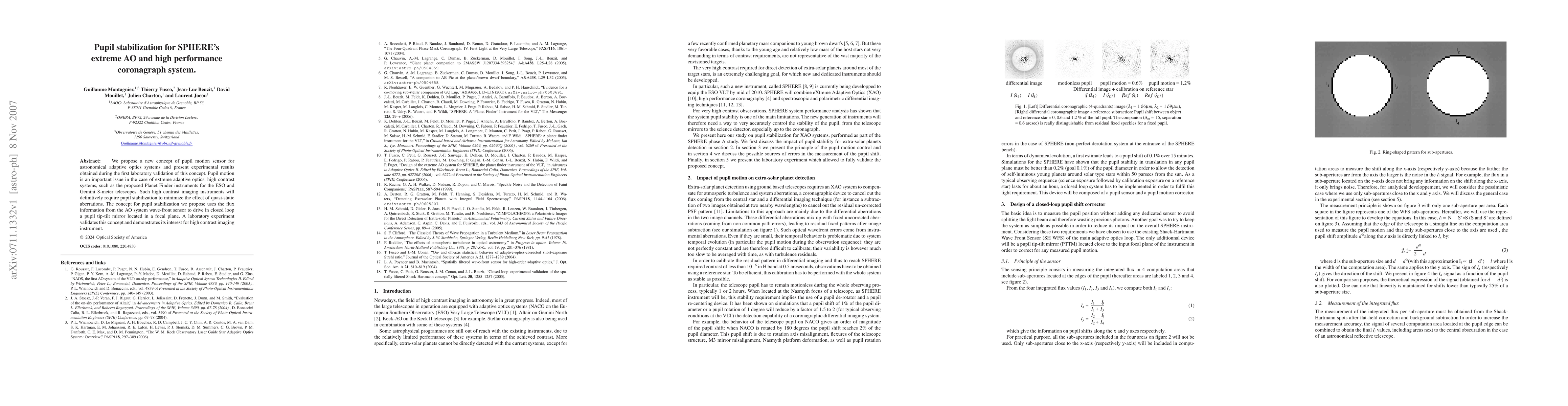 The paper proposes a new pupil motion sensor concept for adaptive optics systems, utilizing flux information from a wave-front sensor to drive a pupil tip-tilt mirror, minimizing quasi-static aberrations for high contrast imaging. Laboratory validation confirms its potential for advanced instruments like the Planet Finder.