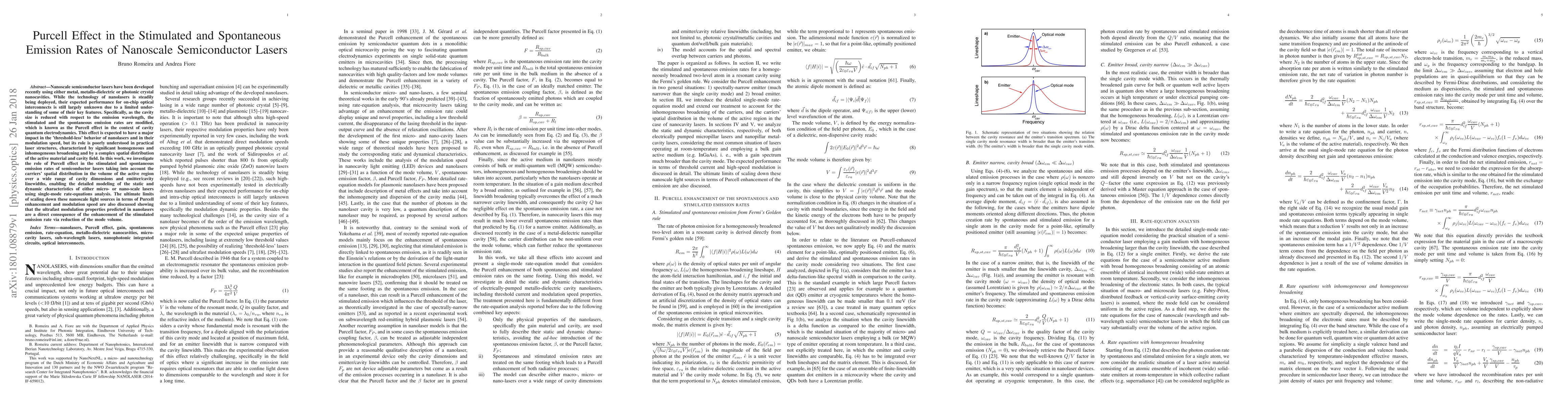 This paper investigates the Purcell effect on the stimulated and spontaneous emission rates in nanoscale semiconductor lasers, considering the spatial distribution of carriers and a range of cavity dimensions. It concludes that the effect significantly influences the modulation speed and threshold-less behavior of nanolasers, with ultrafast modulation properties arising from enhanced stimulated emission due to reduced mode volume.