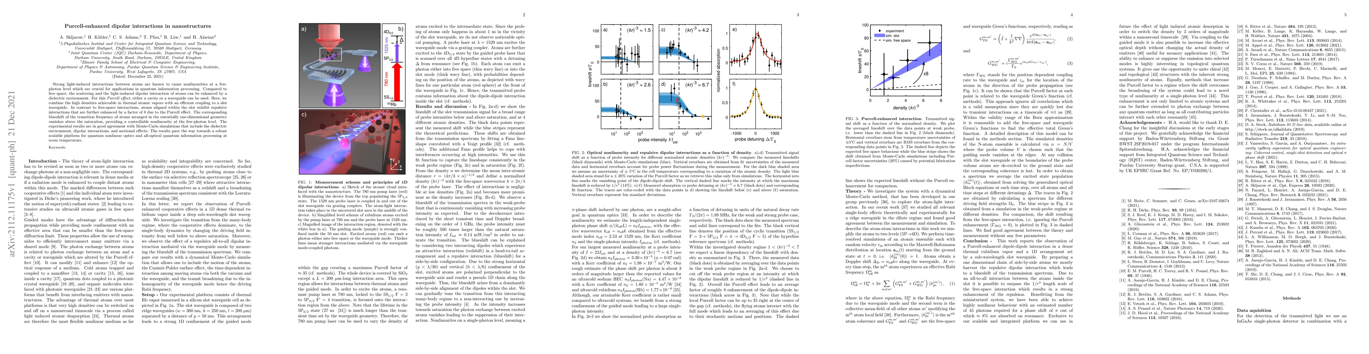 This paper investigates Purcell-enhanced dipolar interactions in nanostructures, demonstrating that atoms aligned within a slot waveguide exhibit enhanced repulsive interactions by a factor of 8 compared to free space, enabling controllable nonlinearities at the few-photon level. The findings suggest a scalable platform for quantum nonlinear optics and quantum information processing at room temperature.