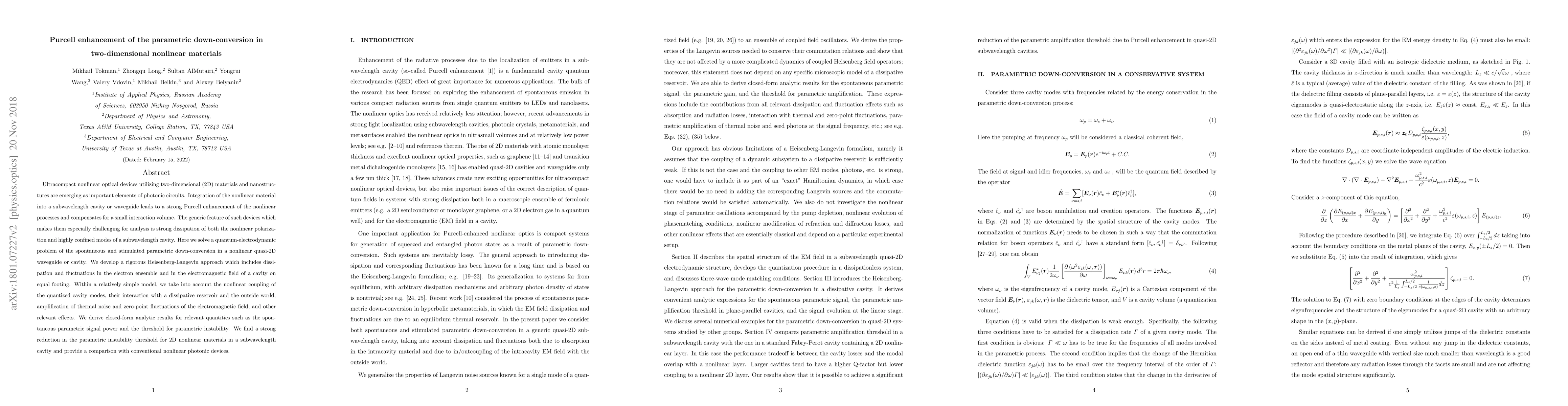 Researchers developed a new model to analyze parametric down-conversion in 2D nonlinear materials, finding strong Purcell enhancement and reduced instability thresholds compared to conventional devices.